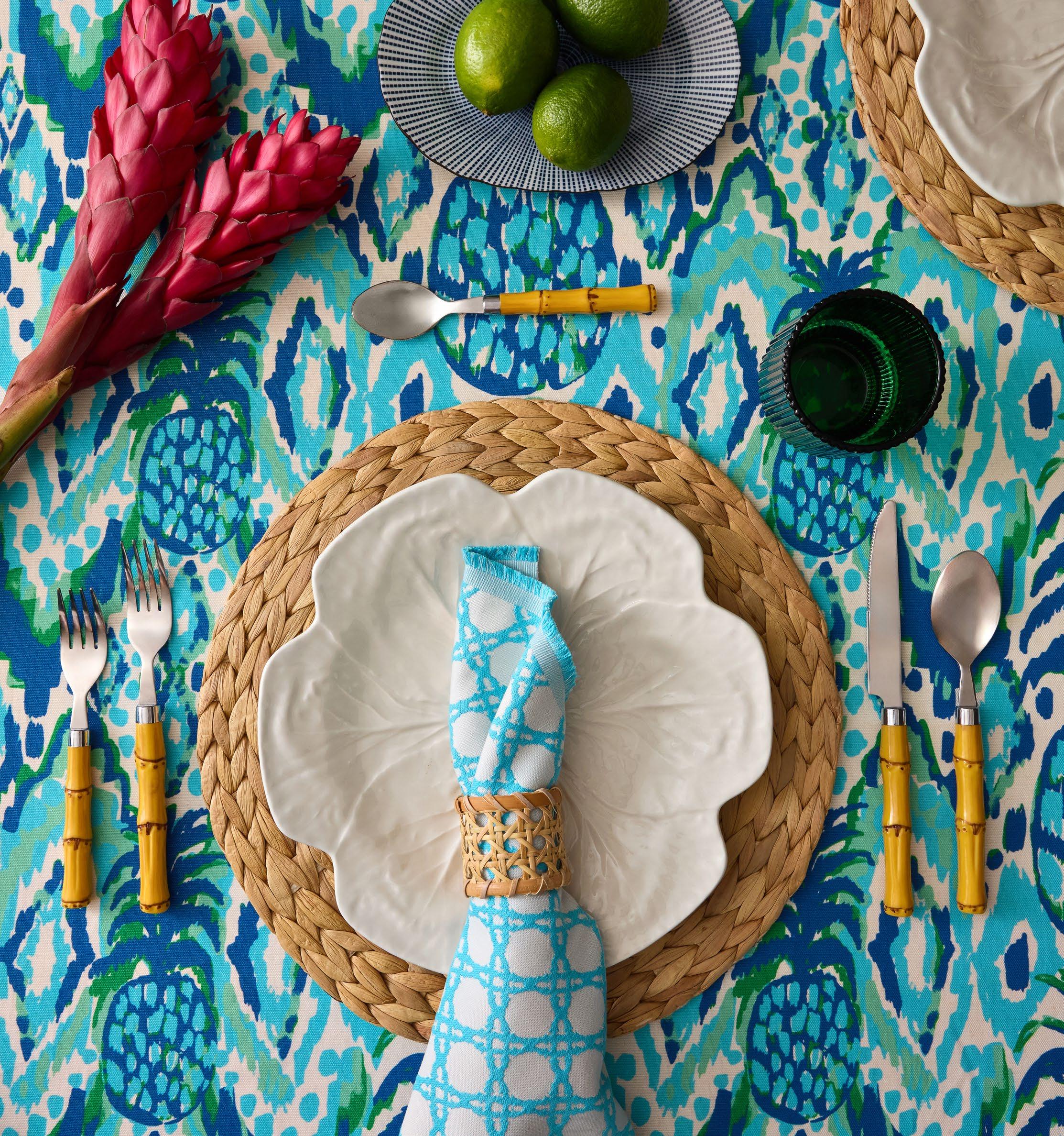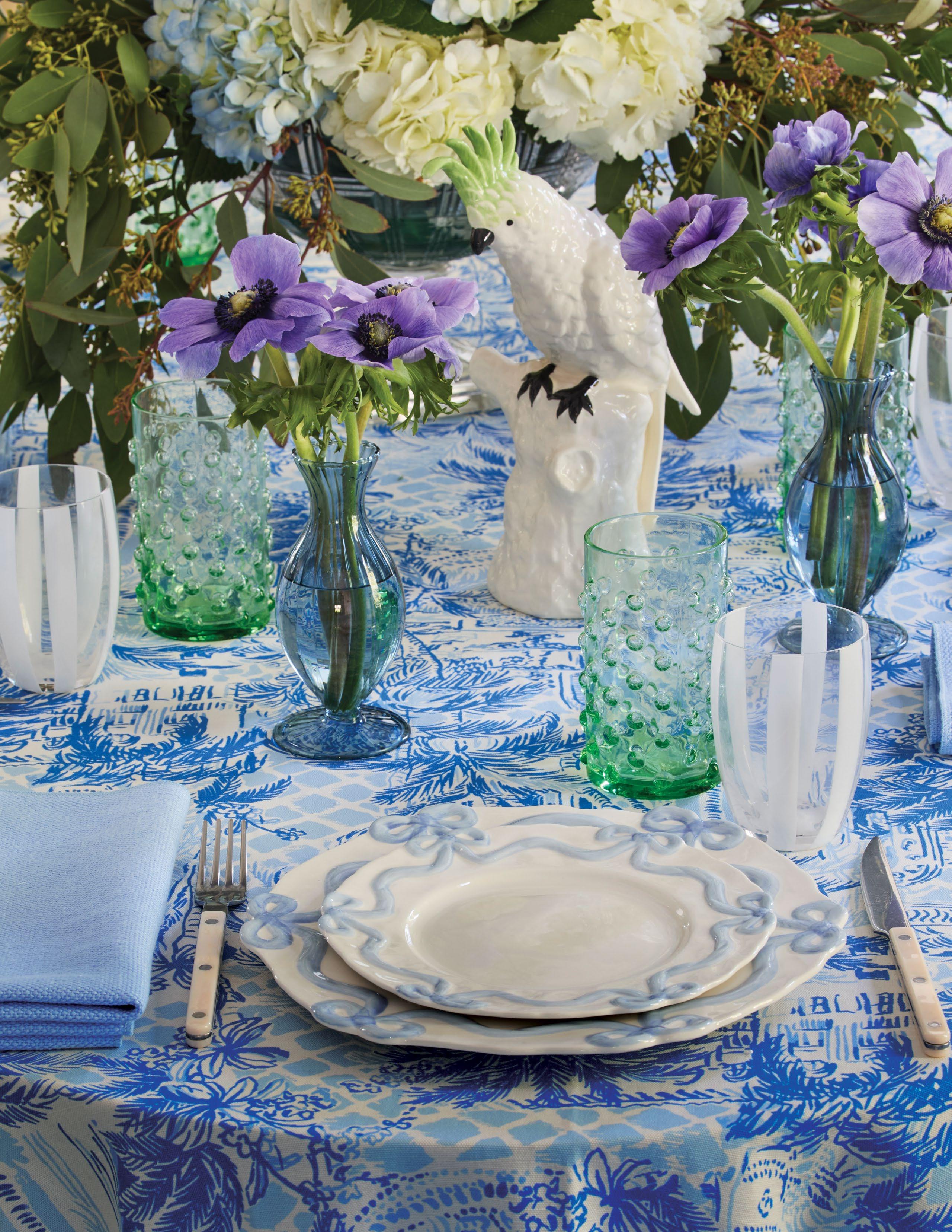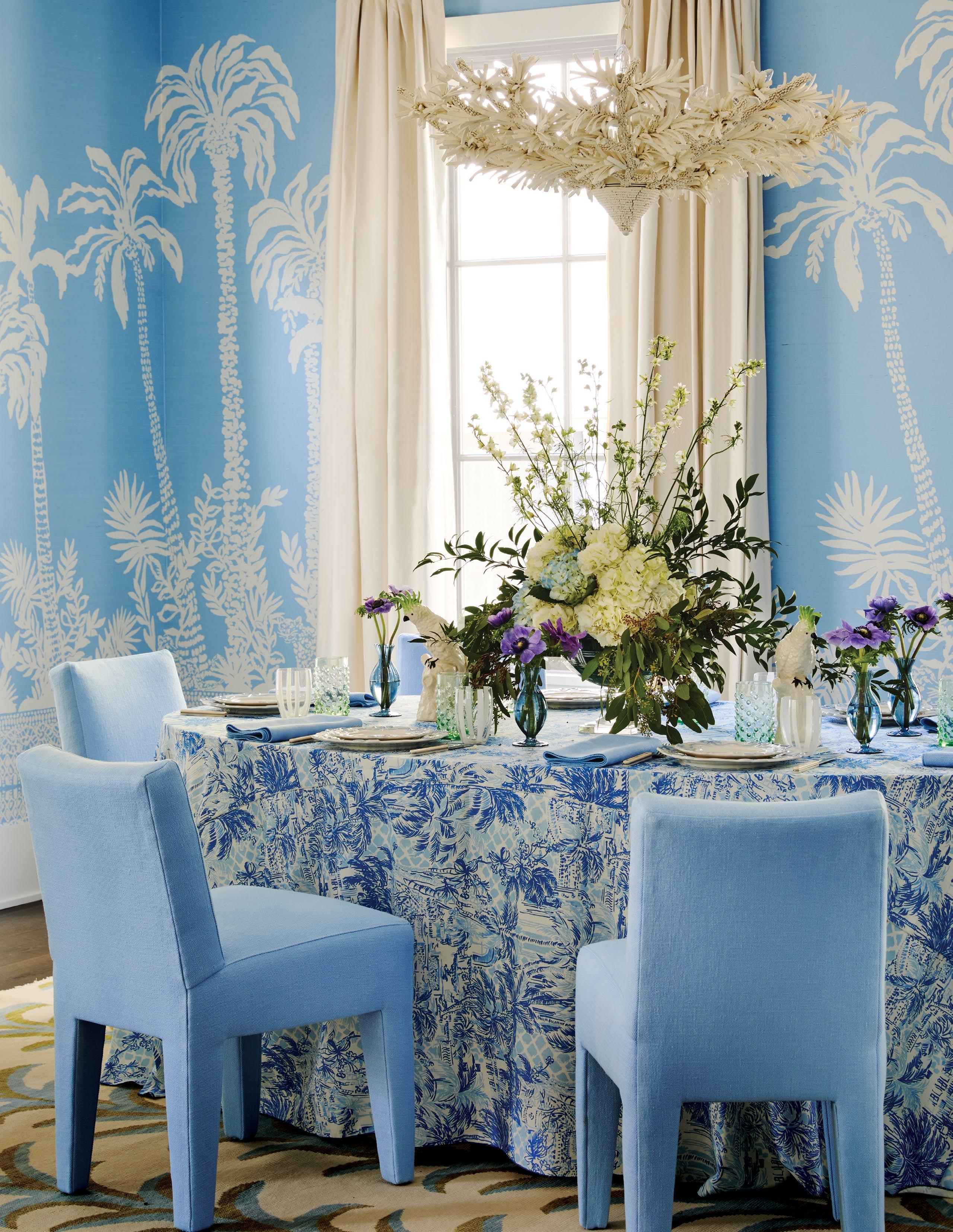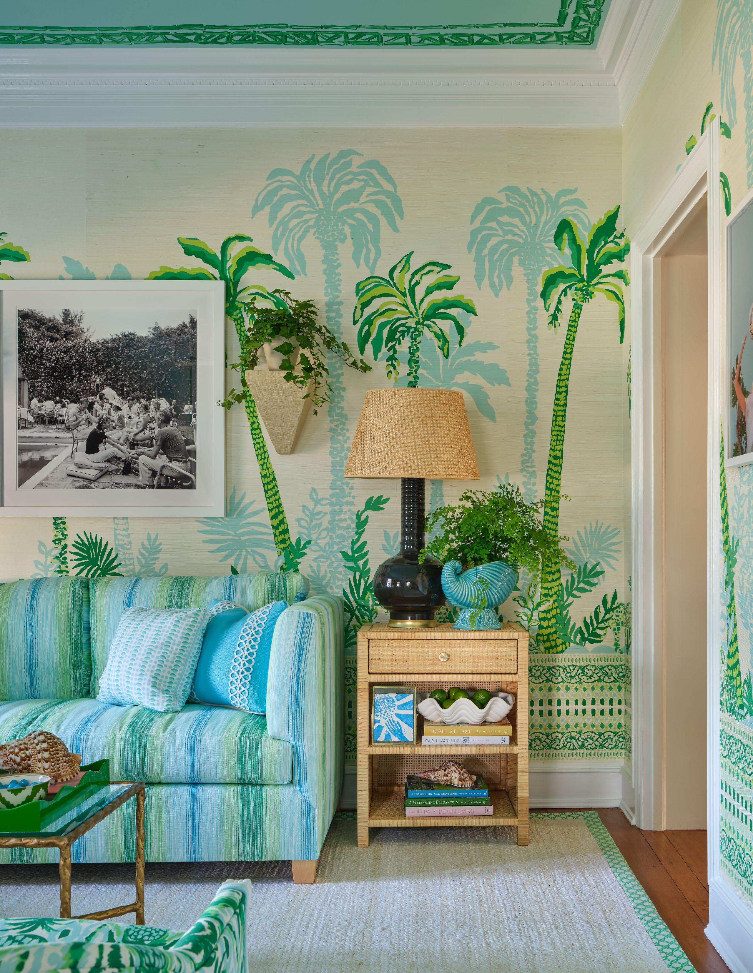 Lilly Pulitzer’s backyard was a Palm Beach jungle full of banana leaves like the painterly fronds of the Go Bananas grasscloth.
