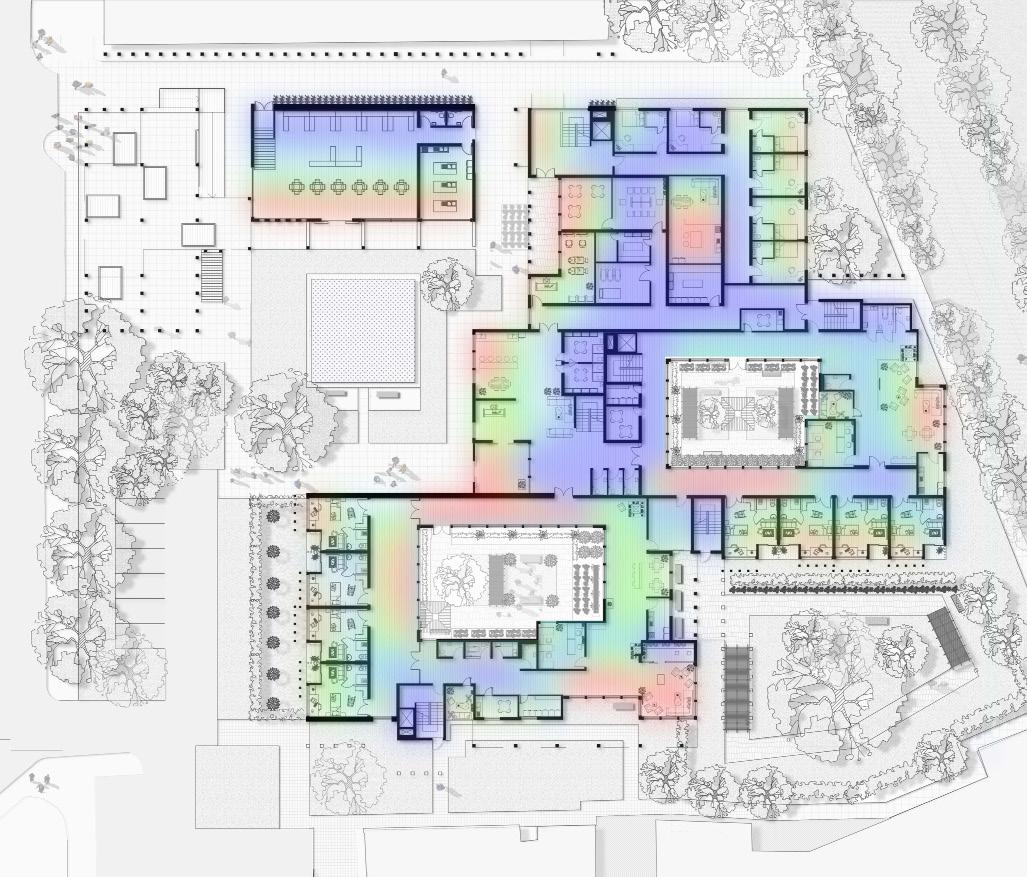 Areas open to Visitors is primarily concentrated to the inner centre of the public courtyard. This improves circulation and comprehensibility of space. Having a controlled access area before entering the dementia wards aids staff in managing the people who have access to the private spaces.