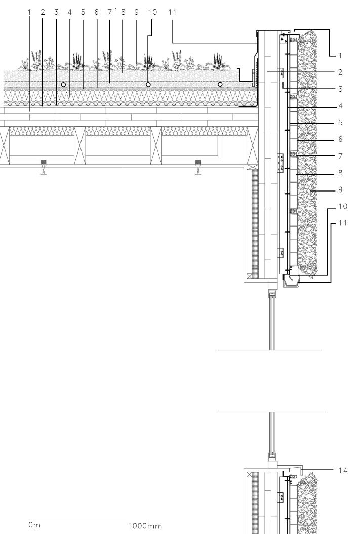 23 - HEATON FOREST Roof Structure 1. CLT Roof Deck 2. Primary Membrane 3. Geosynthetic Sheet Drain 4. Insulation 5. Root Barrier 6. Capillary Fabric 7. Separation Fabric 8. Drainage Media 9. Growing Medium 10. Irrigation Drip Line and Slotted Sleeve 11. Zinc Flashing Exterior Hydroponic Wall Build Up 1. Irrigation Cover 2. CLT Wall Panel 3. Helping Hand Bracket 4. Cladding Rails 5. Waterproof Backing Board 6. 4.5mm Backing Board 7. Biotile 8. 16mm Diameter Pressure Compensates Drip-Line 9. Growing Medium 10. Rear Drainage Layer 11. Gutter 12. Window Cill Flashing