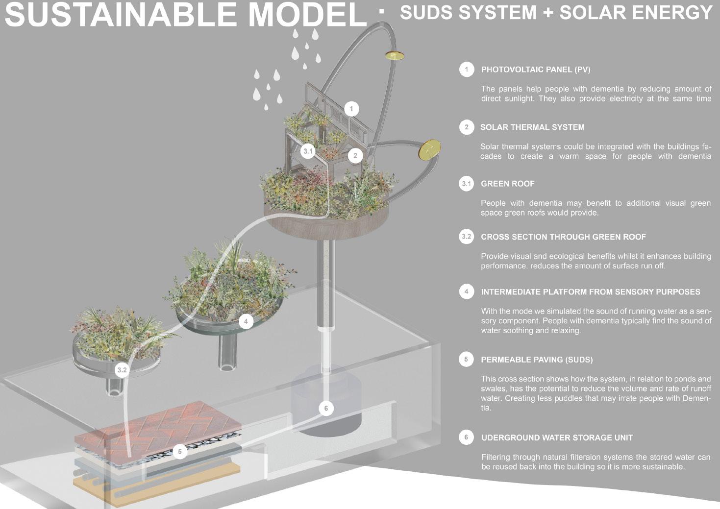 The intention of this design is to illustrate a sustainable building that reduces it's impact on users, the environment and climate change. Attention will be stressed on considering the small details to form thoughtful spaces to compensate for people with dementia's sensory deficits. The building will engage with the wider community.