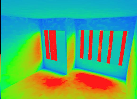 With the addition of the solar shading frame, using IES LUX simulation the light uniformity in plan dramatically improves. Less light is concentrated near the window. This implies that there would be less heavy shadow contrasts which people with dementia may see as a hole in the ground. Creating difficulties in their comprehensibility that leads to increased levels of agitation.