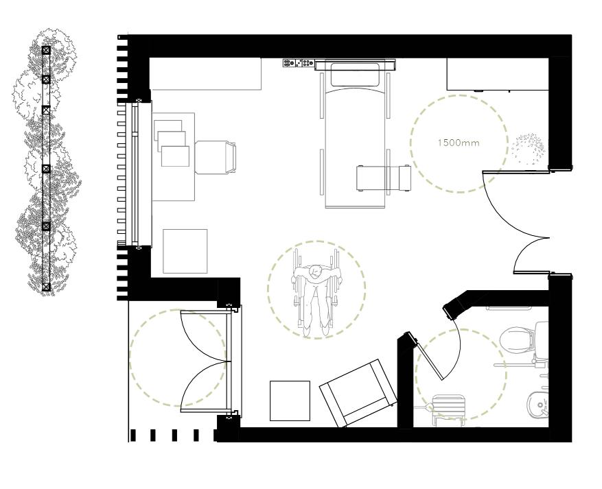 In compliance with Approved document M the spatial design of the pod considers wheelchair movement and better usability. The dimensions of floor and door clearings exceed the minimum amount according to approved document M.