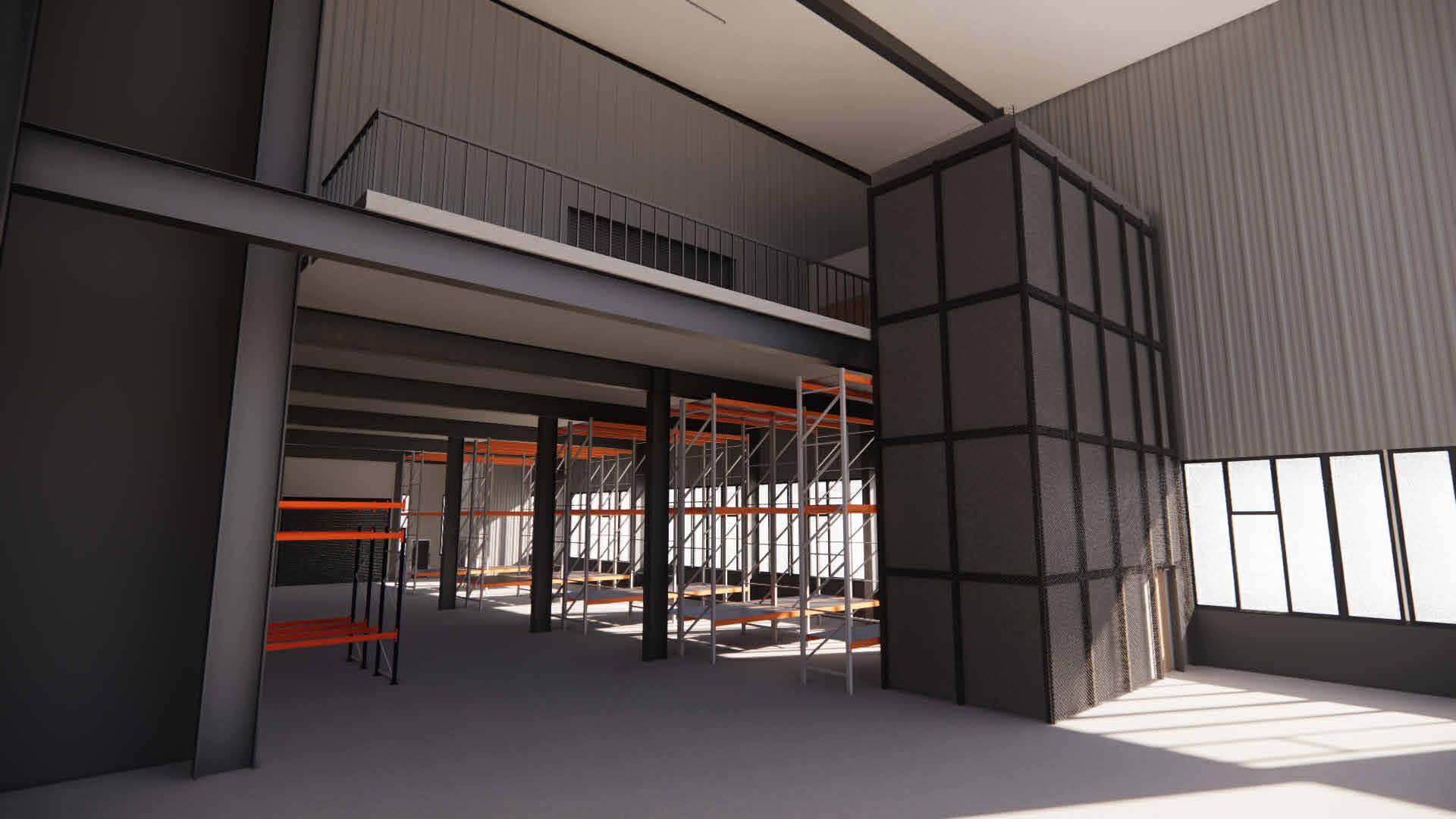 Liebherr approached Napper Architects to prepare proposals for the development of an existing mezzanine storage area, currently accessed via a steeply sloping 'ships ladder', with balcony landing onto which materials are currently craned / lifted via forklift. [Materials access directly associated with apprentice training will continue to use existing crane and landing access, with part of the landing / balcony access to remain operational.] General materials storage is to be relocated to racking at ground floor level, to create space for new teaching classroom and apprentice practical training bays, accessed via a compliant accommodation staircase.