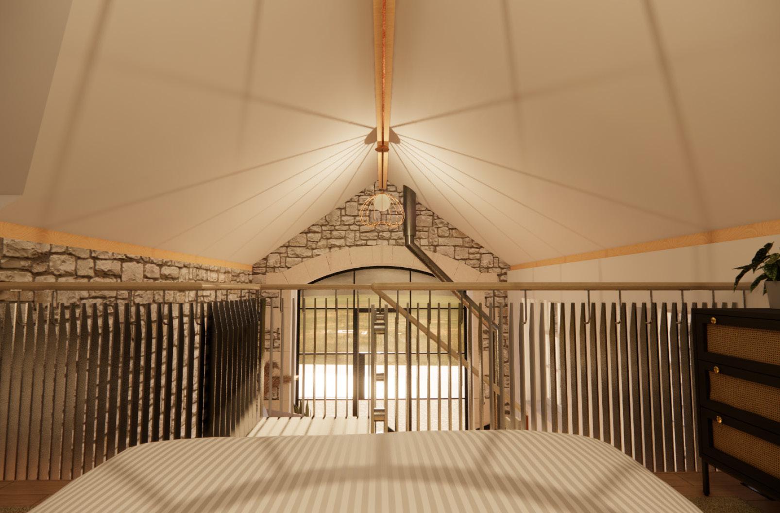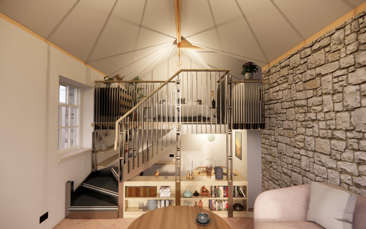 The client wishes to return the building back to its former glory develop the building for their own use, however they would like to retain the potential to use this as a holiday let in the future. The accommodation is to provide, entrance hall, toilet/shower room, open plan kitchen/dining/ living and an enclosed/semi enclosed mezzanine bedroom with bath en-suite.