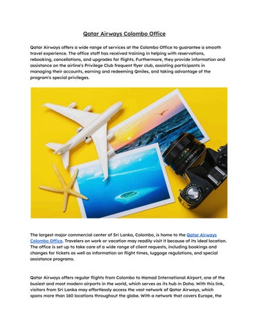 Americas, Africa, the Middle East, and Asia-Pacific, Qatar Airways is a top option for tourists traveling abroad. Through its dedicated o ce, Qatar Airways, a well-known airline worldwide, o ers its excellent services to the energetic city of Colombo, Sri Lanka. With a range of services that represent the airline's dedication to excellence, the Qatar Airways Colombo O ce, conveniently located in the center of the city, is a vital hub for travelers in need of assistance with their travel plans.