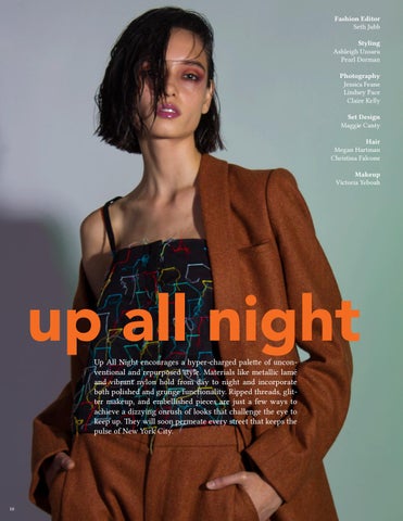 up all night Up All Night encourages a hyper-charged palette of unconventional and repurposed style. Materials like metallic lamĂŠ and vibrant nylon hold from day to night and incorporate both polished and grunge functionality. Ripped threads, glitter makeup, and embellished pieces are just a few ways to achieve a dizzying onrush of looks that challenge the eye to keep up. They will soon permeate every street that keeps the pulse of New York City.