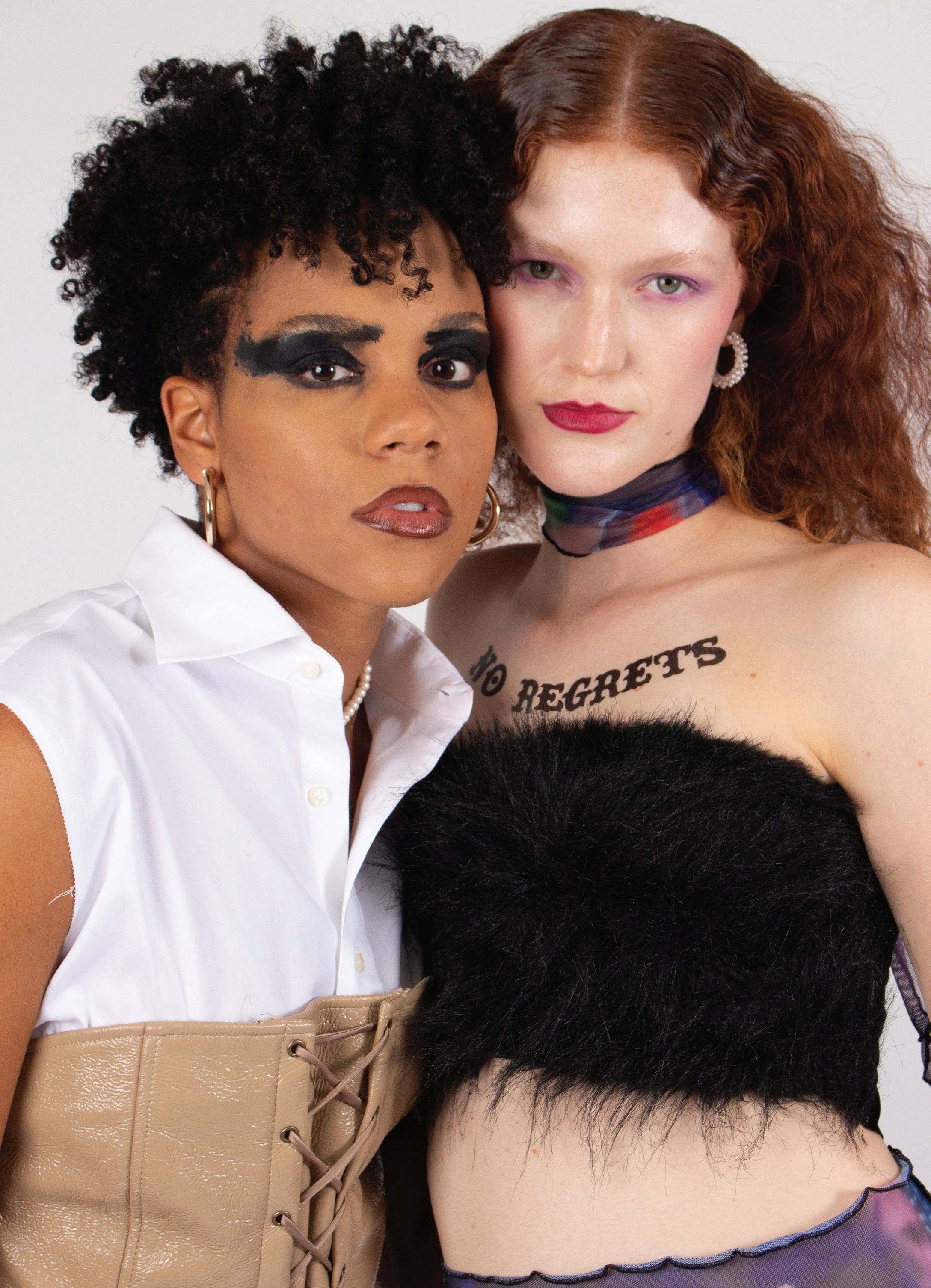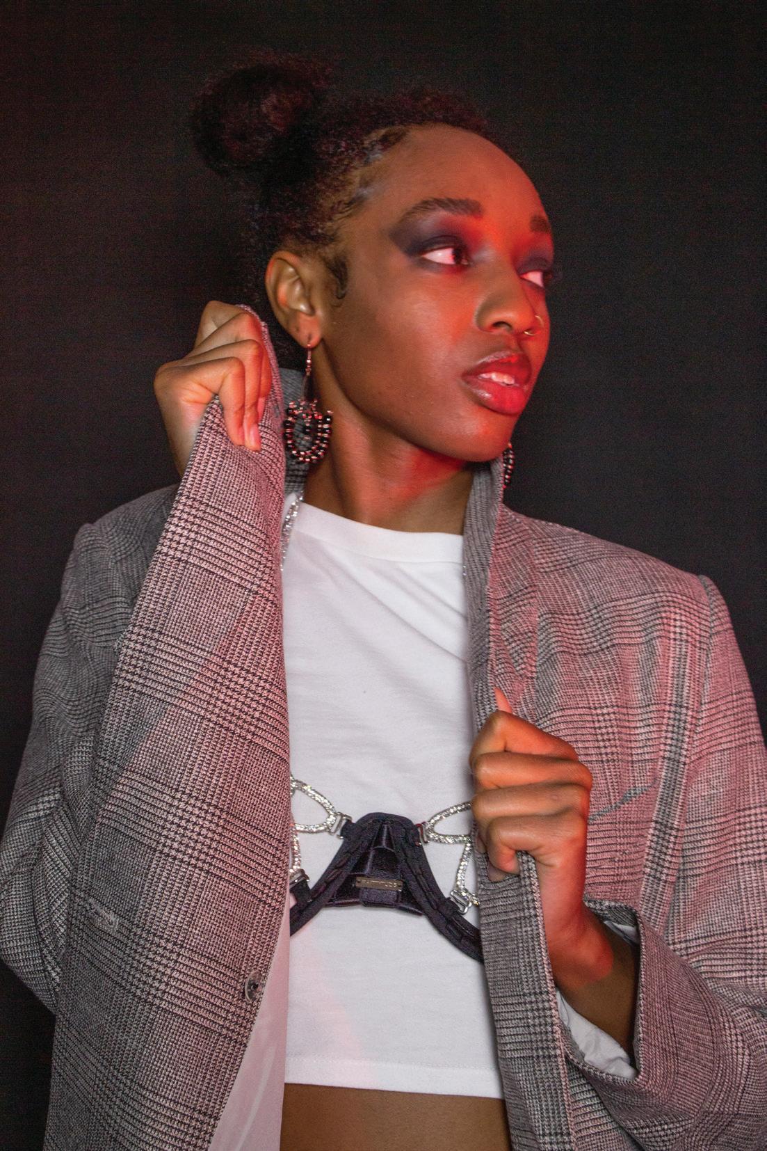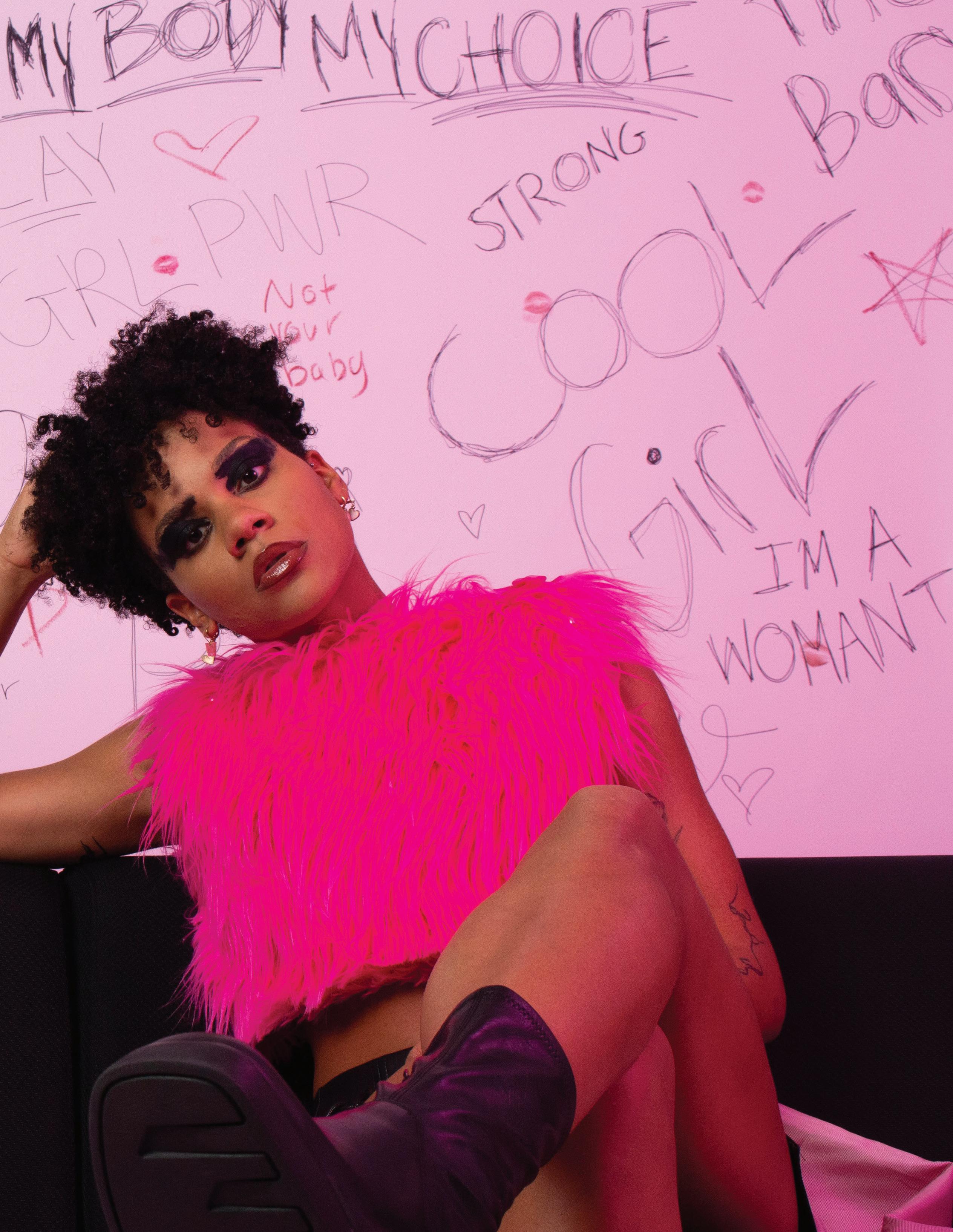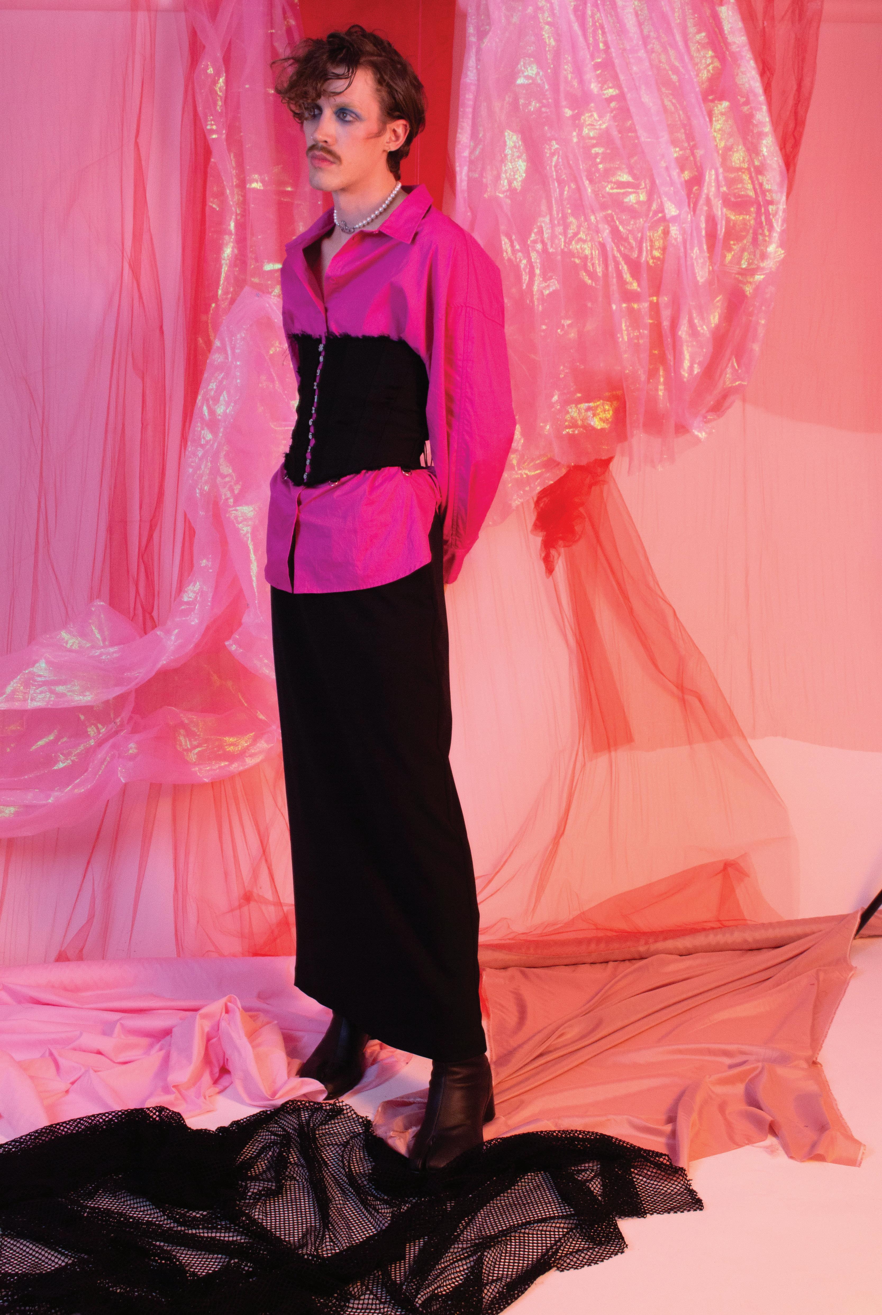 In these pages, we highlight multiple facets of the female experience. We have articles that touch on female beauty standards, infertility, and the laws being unjustly placed on our bodies. Femininity is often associated with being soft and fragile, so we wanted to juxtapose norms with our fashion editorial spread. We were able to utilize the campus's photo studio to create multiple sets that feature hues of pink, red, and black. Our styling team pulled structured garments such as blazers and trousers along with conventionally feminine pieces such as slip dresses and heels to show the duality of womanhood.
