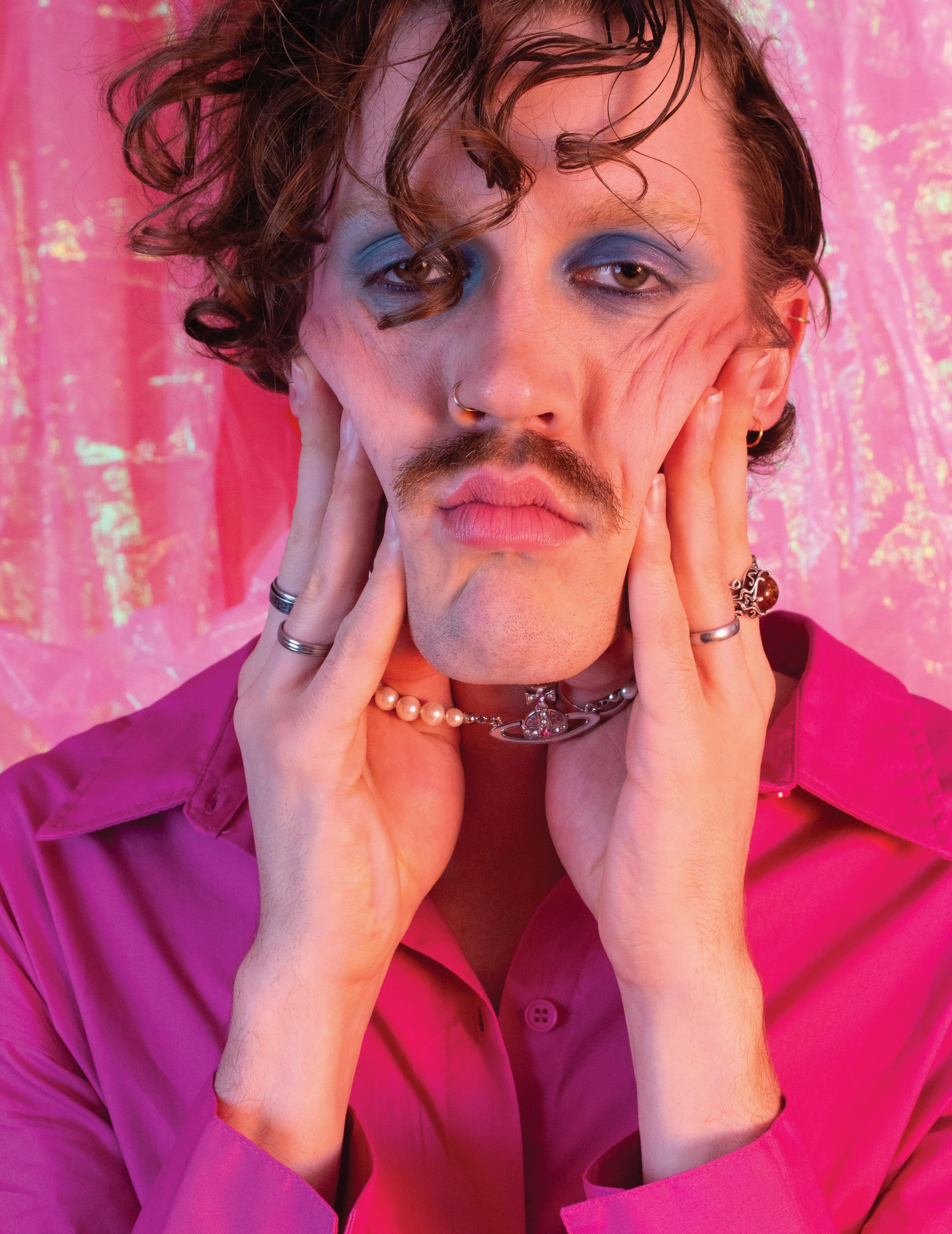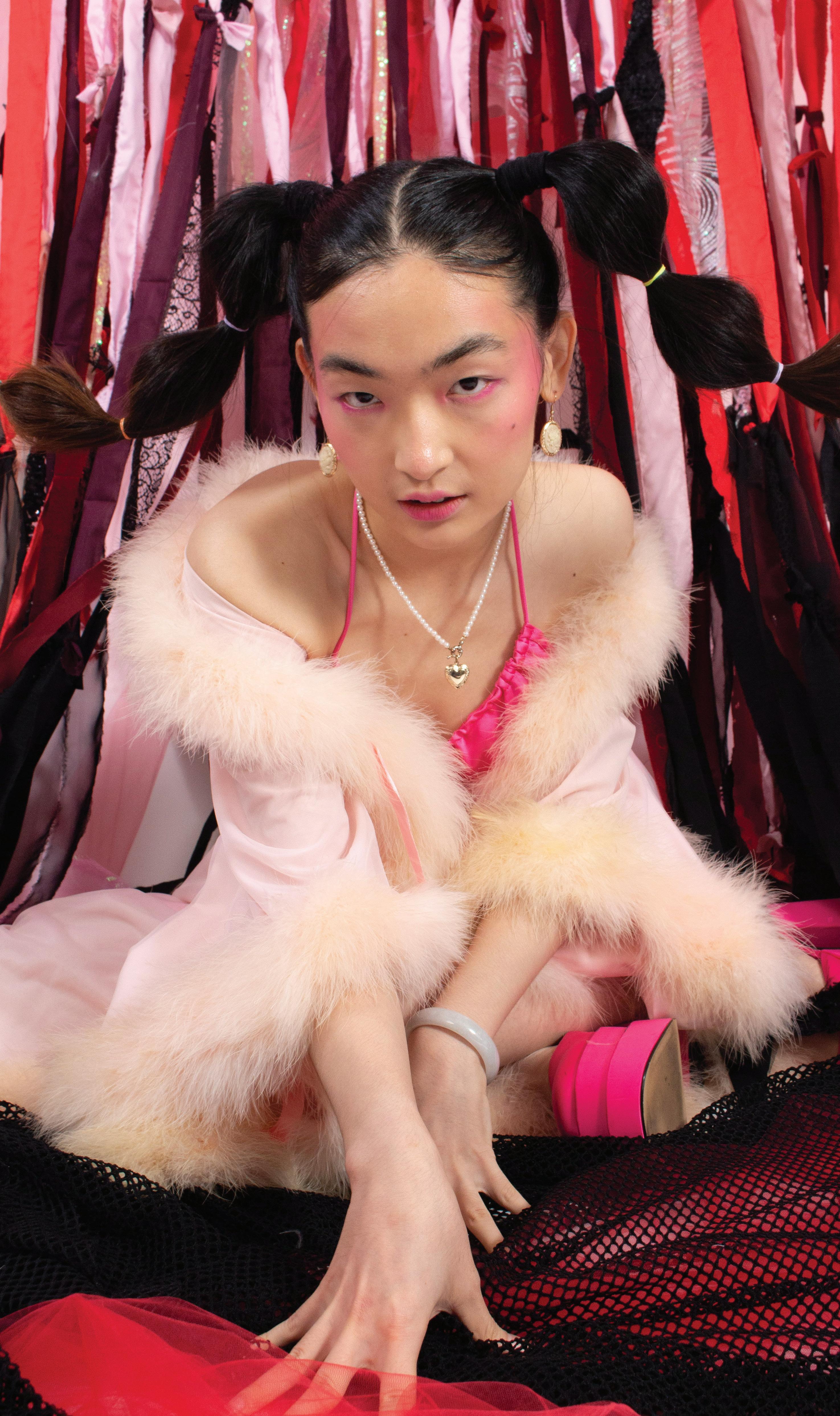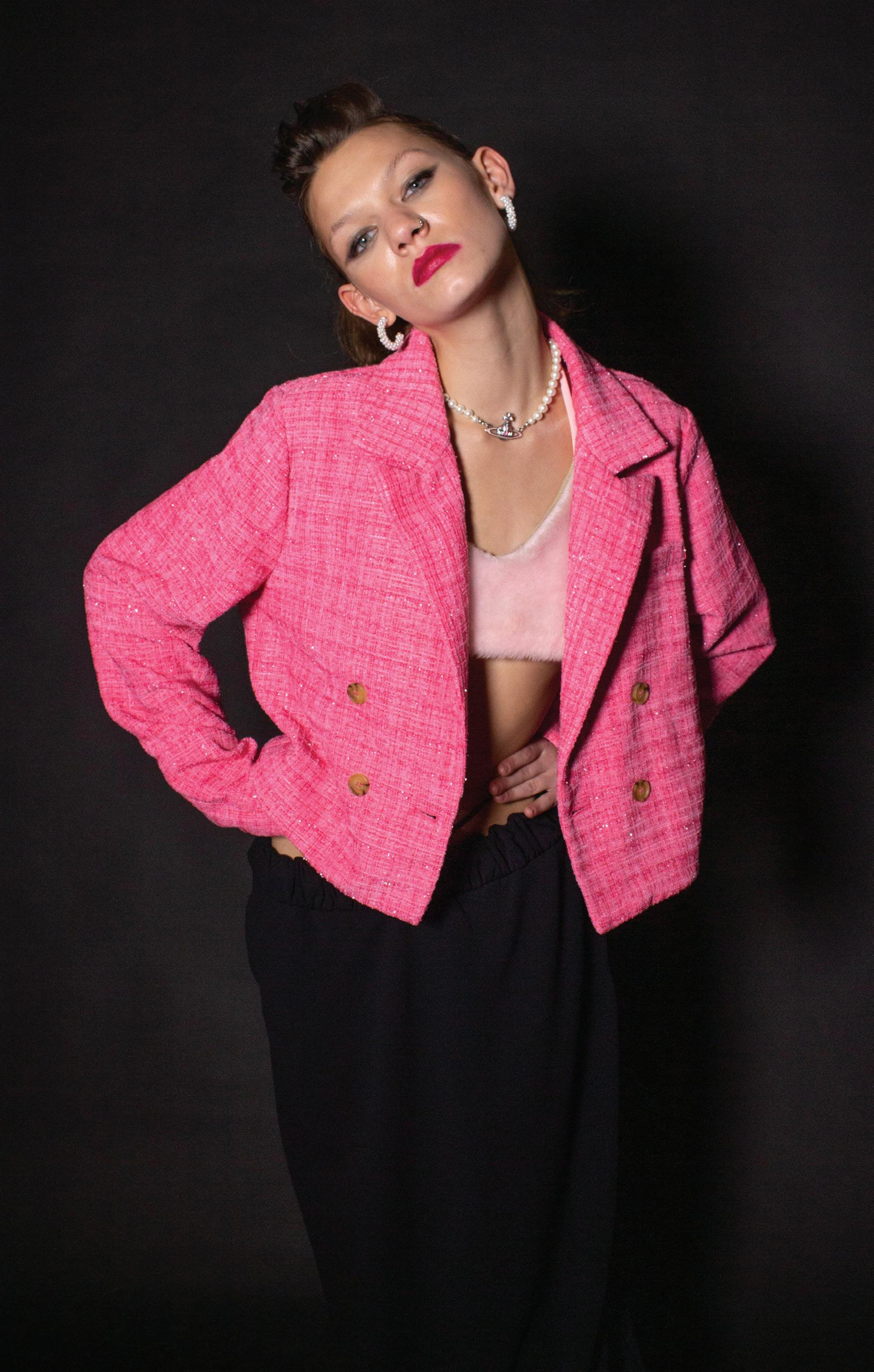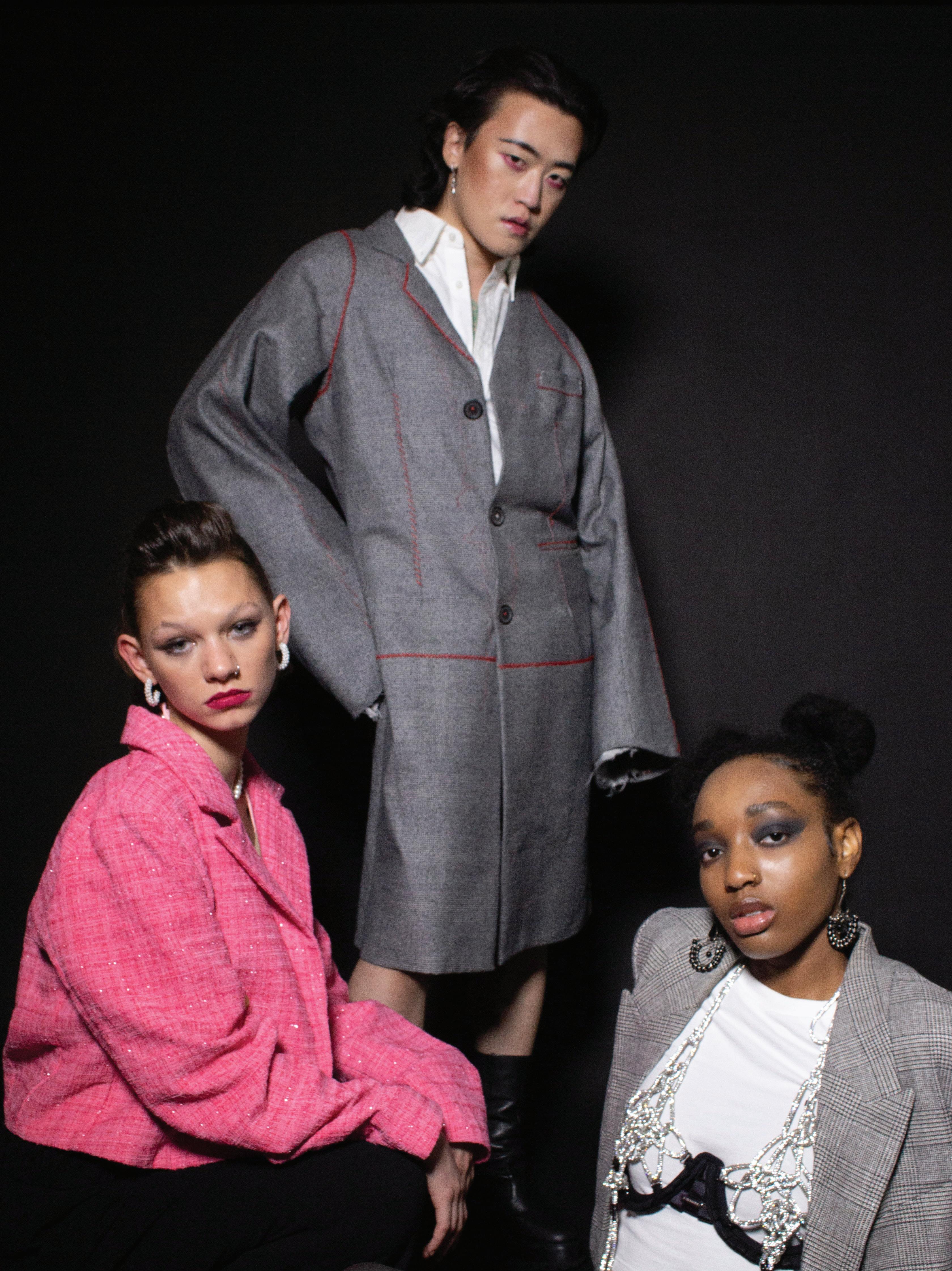In these pages, we highlight multiple facets of the female experience. We have articles that touch on female beauty standards, infertility, and the laws being unjustly placed on our bodies. Femininity is often associated with being soft and fragile, so we wanted to juxtapose norms with our fashion editorial spread. We were able to utilize the campus's photo studio to create multiple sets that feature hues of pink, red, and black. Our styling team pulled structured garments such as blazers and trousers along with conventionally feminine pieces such as slip dresses and heels to show the duality of womanhood.