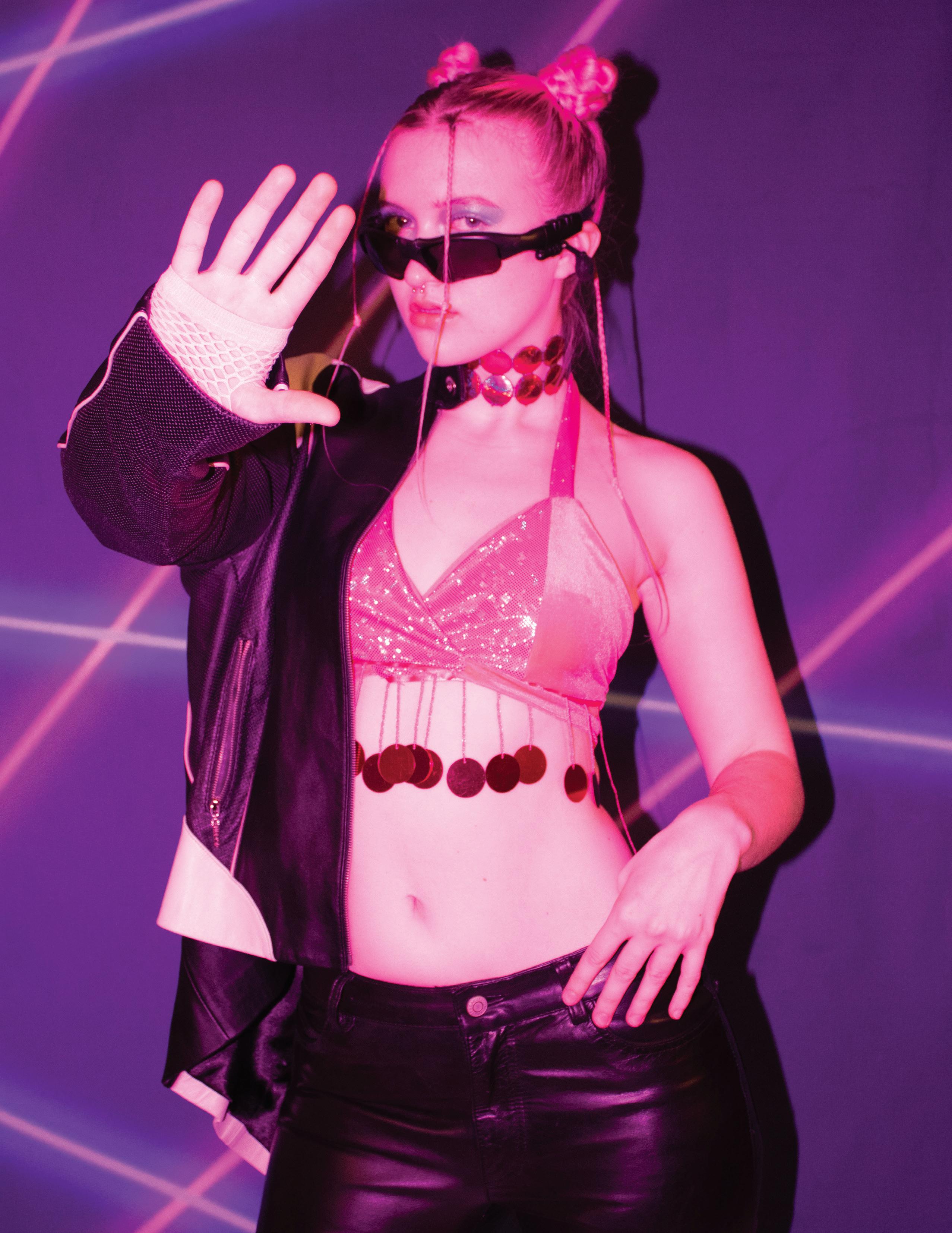 MODEL RIGHT WEARS: Emma Altman—Chocker, Top; Stylist's Own—Jacket, Pants, Shoes