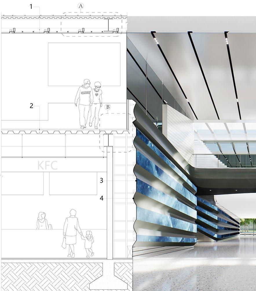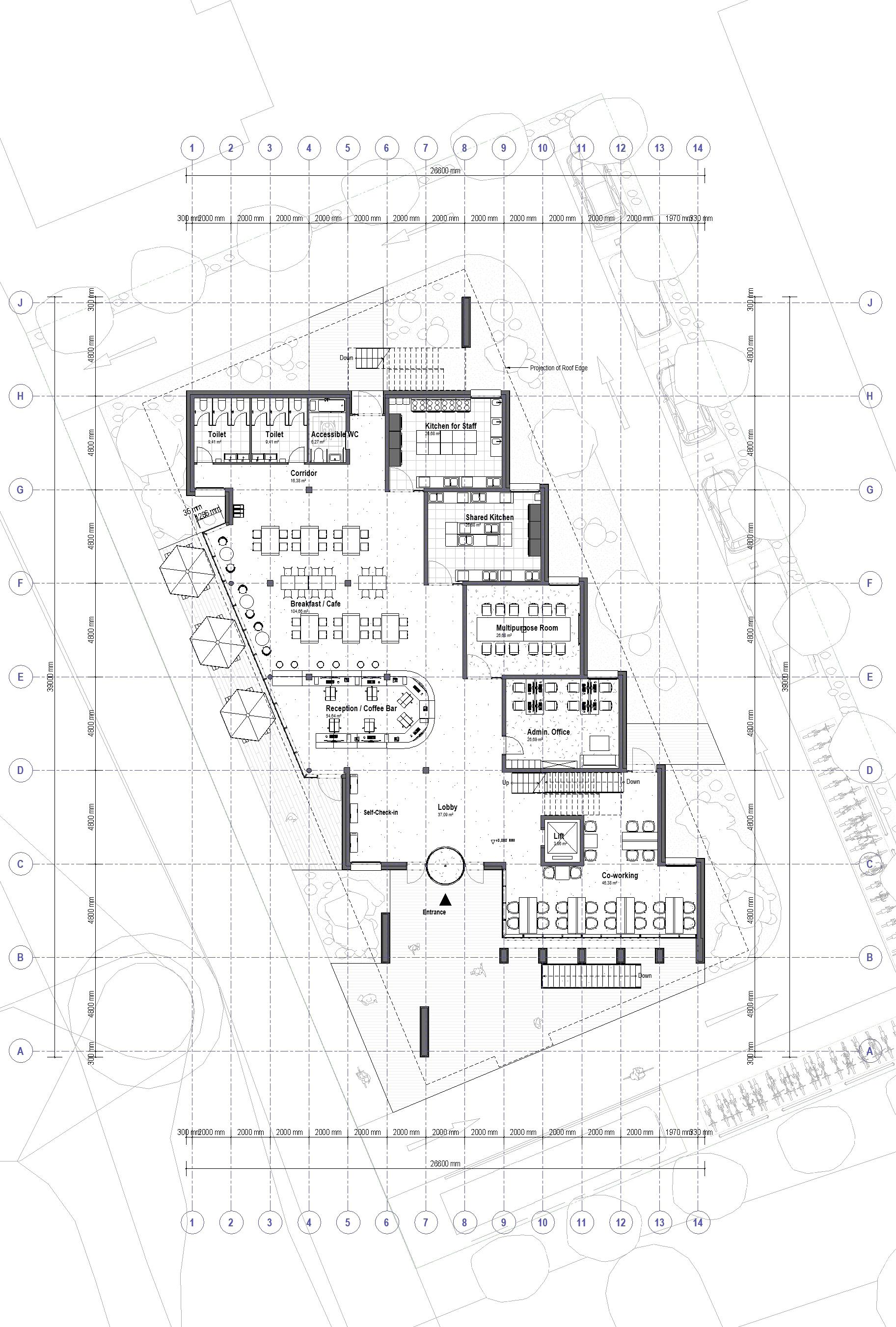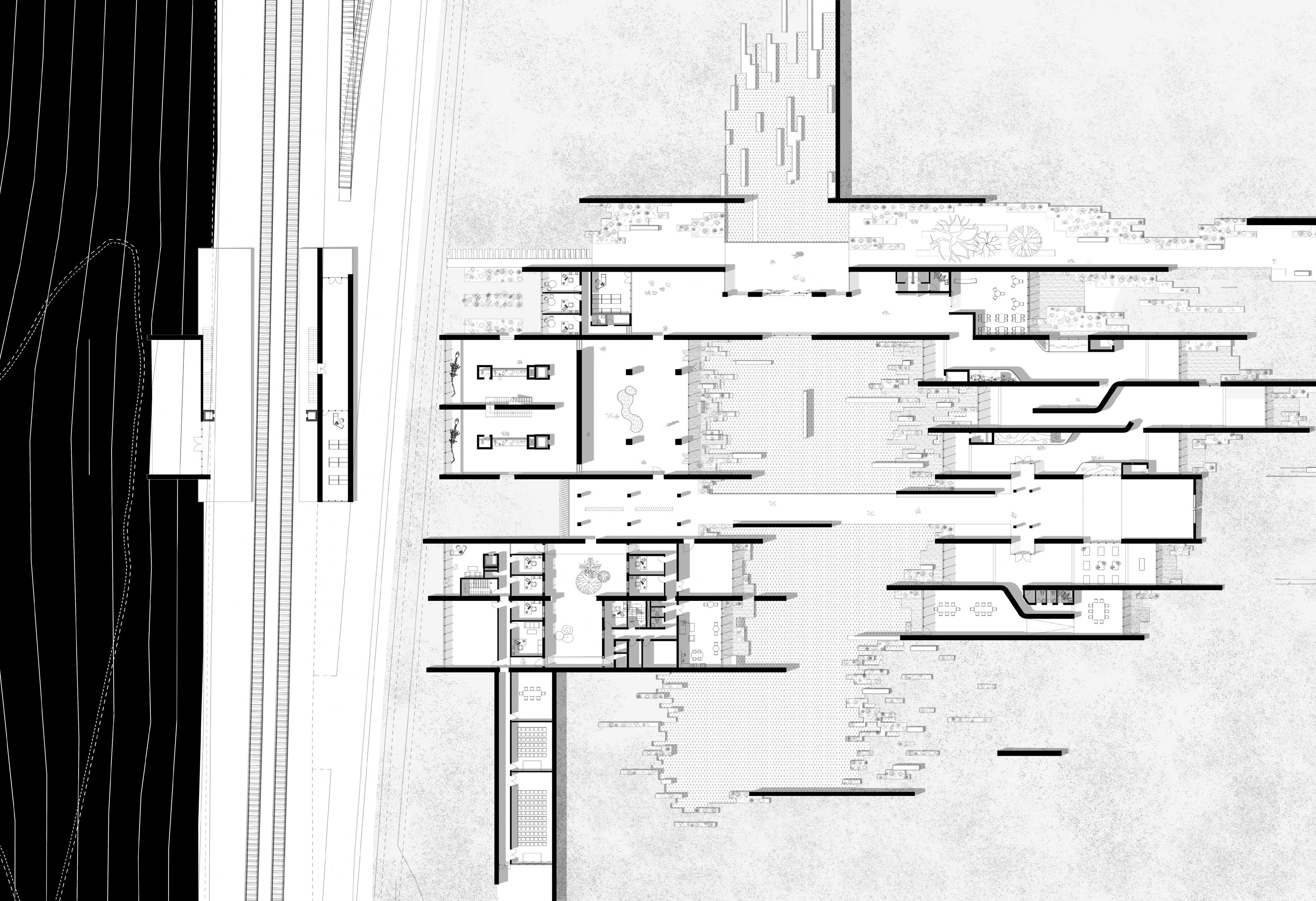 The entire project plan is dominated by the commercial zone in the middle, and the others different supporting area are around the zone by referring to the circulation flows. The building block in the middle is divided into 6 areas by the purest method of 'cutting the cake' to respond the form of the roof and its skylight. The first floor is dominated by public activity spaces, while the second floor is a relatively quiet area for rest and communication.