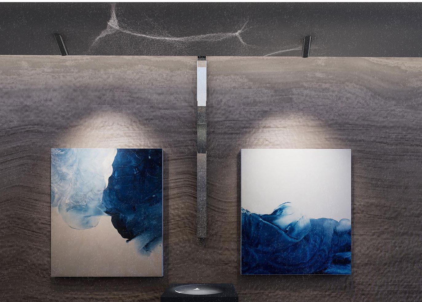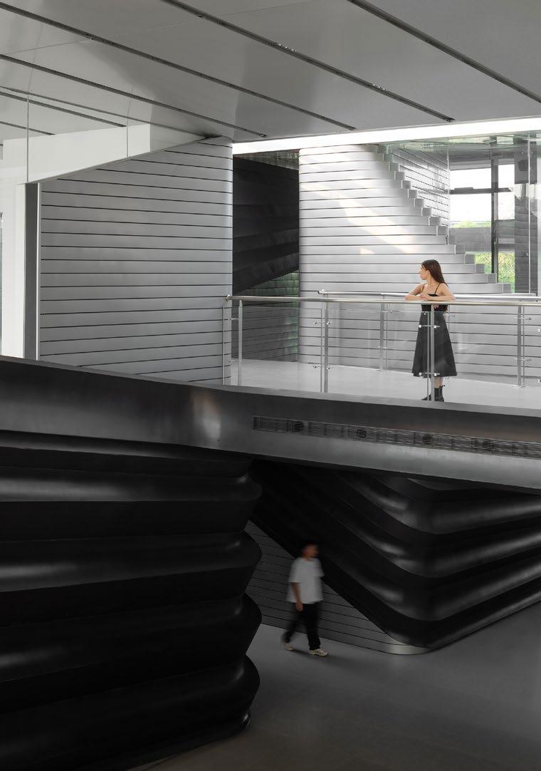 The design carefully incorporates natural elements—light, rain, and topography—to enhance the gallery's tranquil ambiance. Diffused daylight, introduced through a meticulously designed roof structure, illuminates the display walls while minimizing glare. During rainfall, vertical stainless-steel channels guide water across the façade and interior walls, forming serene pools. Indoors, these pools reflect soft ripples onto the ceiling under artificial lighting, establishing a poetic interplay with the artwork.