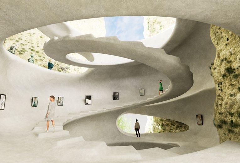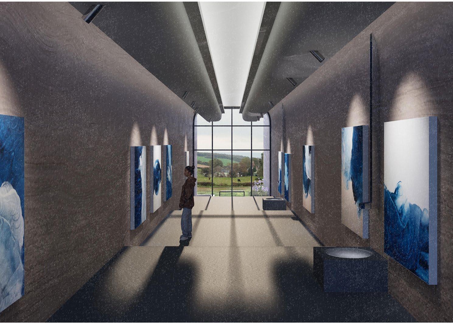 Located at the edge of St. Margaret’s residential area and the Kent Downs National Landscape, this gallery is designed to exhibit ten tempera paintings by artist Joanna Jones. The project explores the relationship between art, architecture, and nature by drawing inspiration from the Dover coastline’s distinct topography. The building unfolds as a linear form that gently follows the site's 10-meter slope, guiding visitors through a sequence of descending interior spaces that culminate in a panoramic viewing platform.