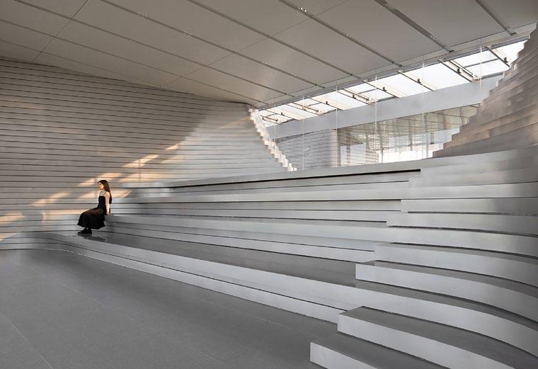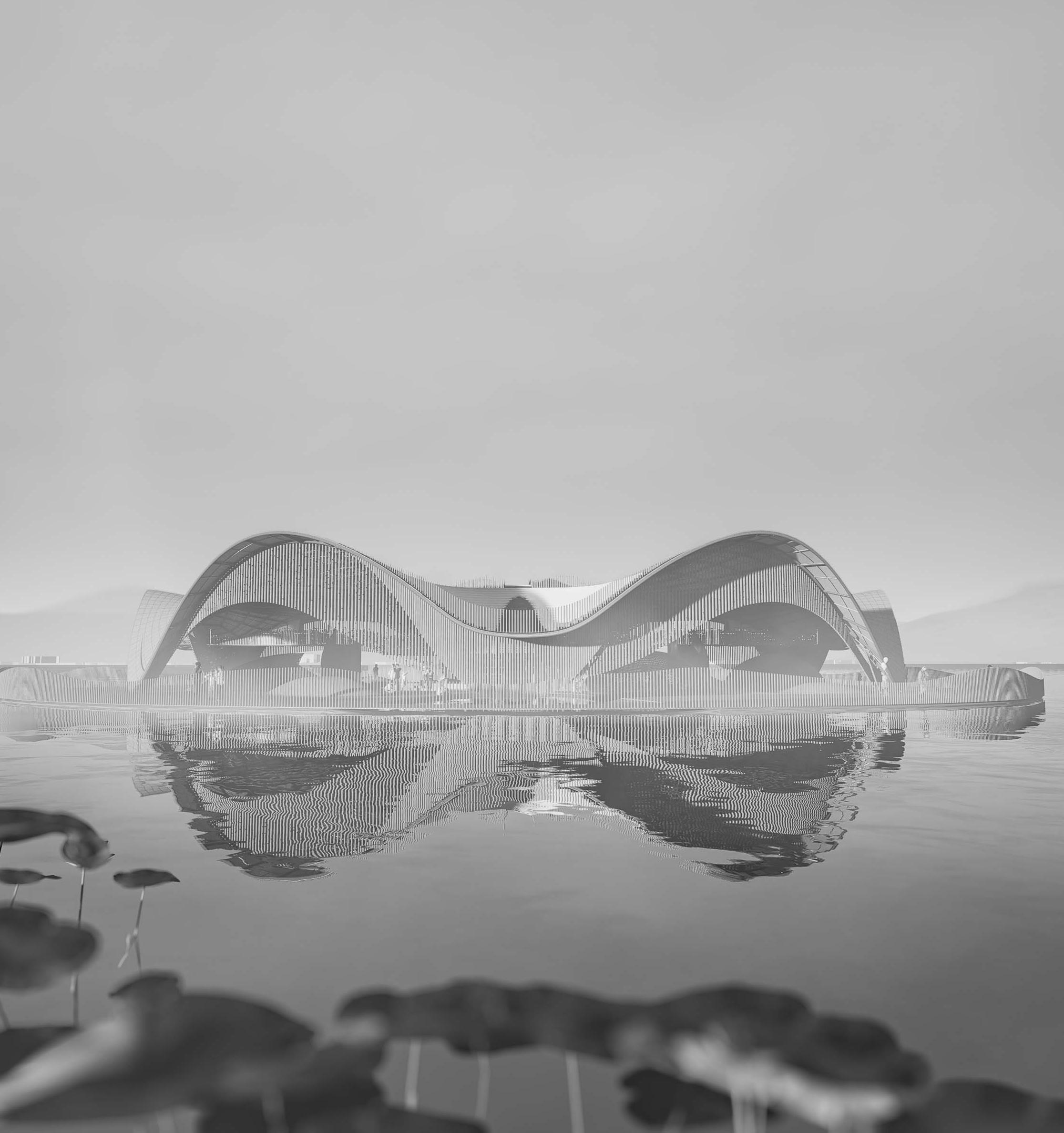 By day, the building floats on water like a lotus, its elegant curves mirroring the distant mountains and rippling waves.