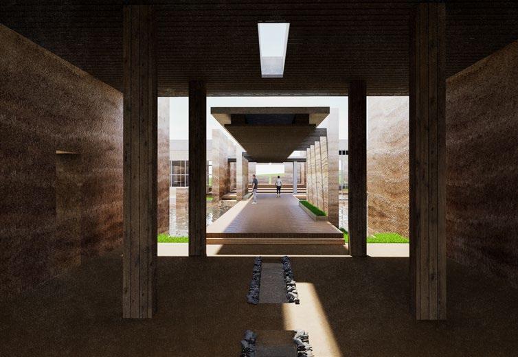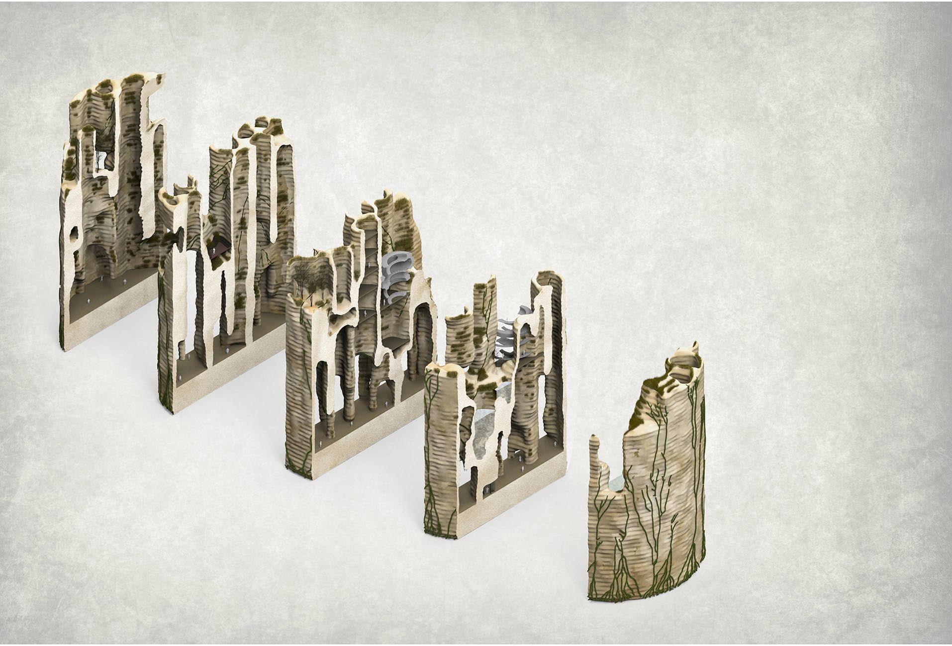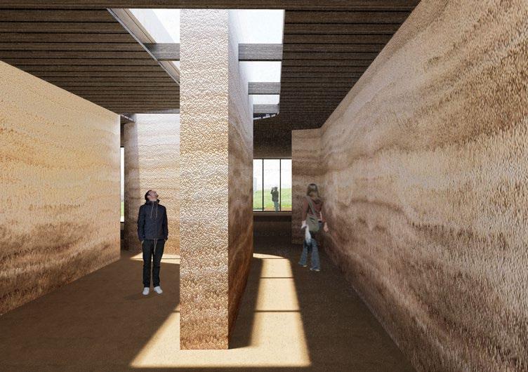 Soil from different ages has different characteristics. By using the rammed earth wall construction technique to mix chalk and cement to design a special "narrative wall". These significant walls in my design become part of the xhibition directly, bringing visitors a more immersive experience.