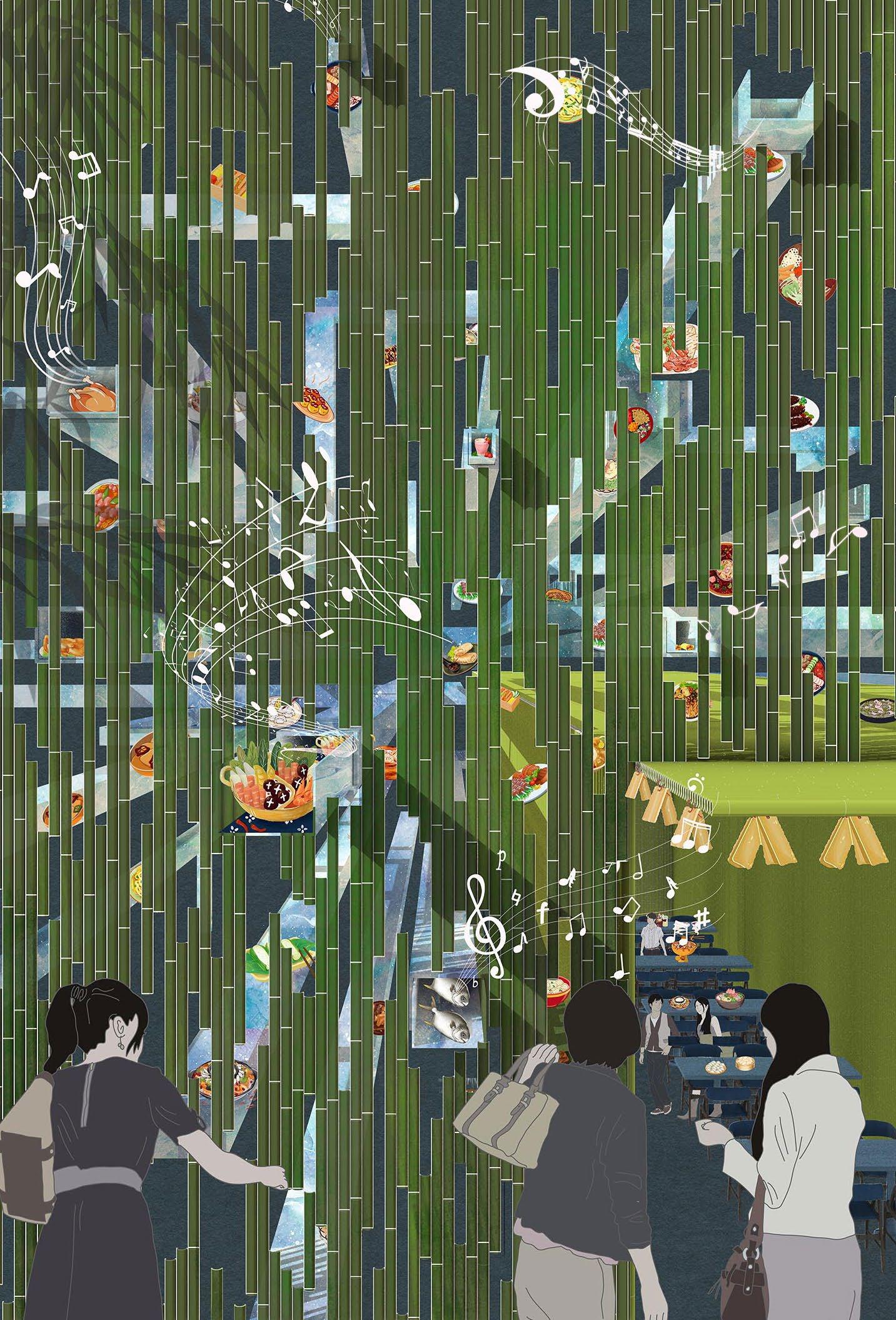 At night, hidden lights glow through the hollow bamboo like scattered stars, turning the building into a festive river lantern drifting across the water.