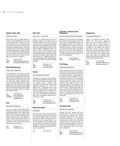 The Yacht Club Restaurant & Lounge Bar Boasting the finest vantage point over Limassol Marina, The Yacht Club is open to the public and includes a bar, a relaxing lounge and restaurant. The menu features fine, fresh island cuisine. The well-stocked cellar balances the best local and reputable imported wines. A full range of spirits and innovative cocktails complete the drinks list. Shisha service also available. DJ music after 22:00. Open all year round, seven days a week, 10:00-02:00. TEL: EMAIL: WEB: