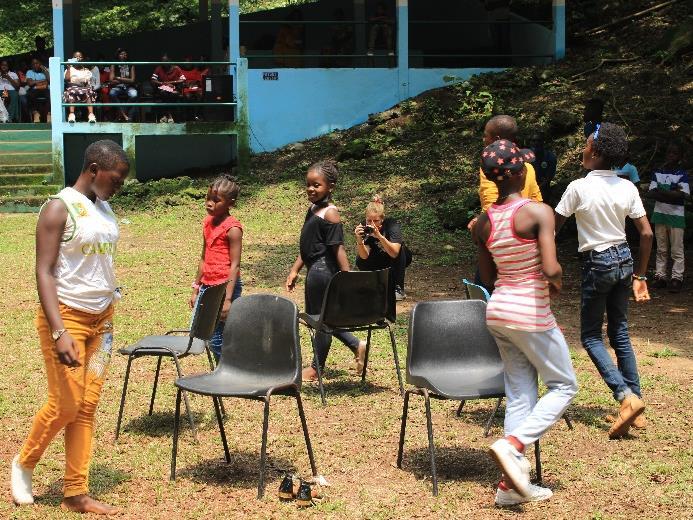 Image 44. The winner of the 2020 edition “Limbe Got Talent” came as a special guest invited by Da Nzimbistic to sing her success song in front of the children. Image 45. A musical chairs game was organised on stage, and a boy and a girl from each school came to compete for fun.