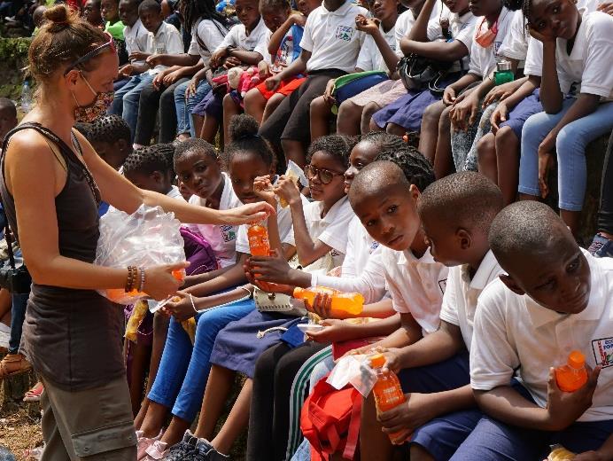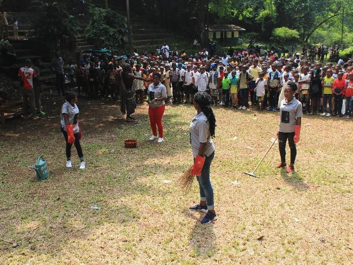 Image 41. The School Outreach Programme Event took place at the Jungle Village inside the Limbe Botanical Garden, an ideal place to gather close to 500 children outside while having a stage and seats. Students from the six different schools (GBHS Limbe, PNEU, Ibolyka, PS Bota, Spring of wisdom and SONARA) were present. Image 42. The occasion started at 10:00 am and ended at 2:30 pm. The event was opened with a small speech of Wilson Ateh, head of education, thanking the children for their investment in the LWC environmental classes.