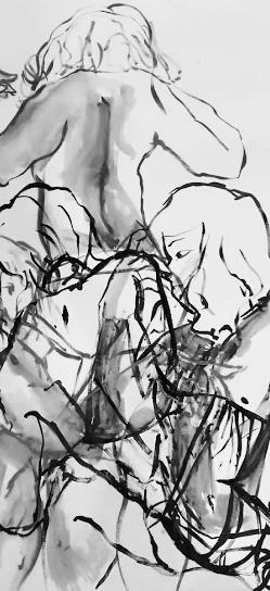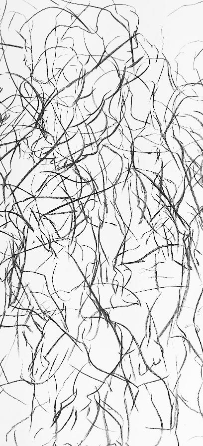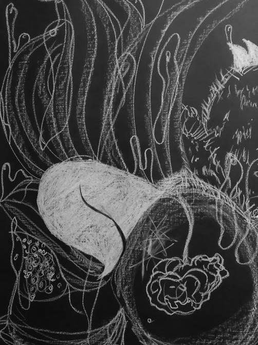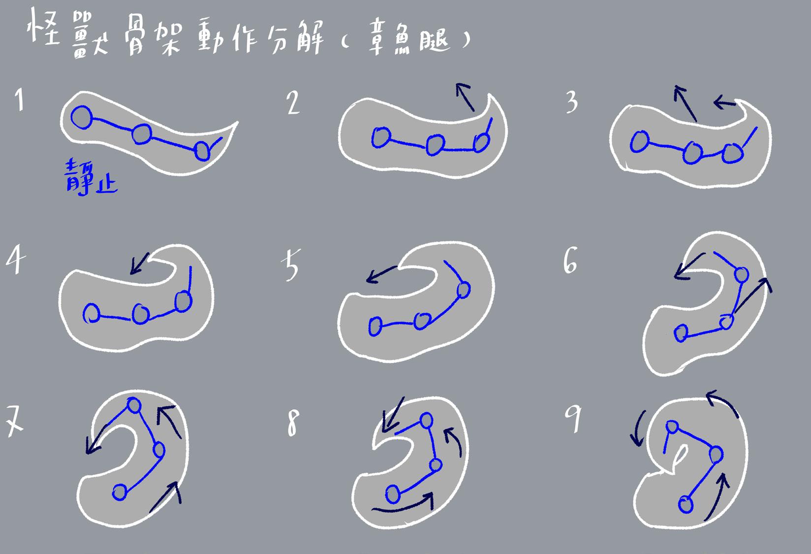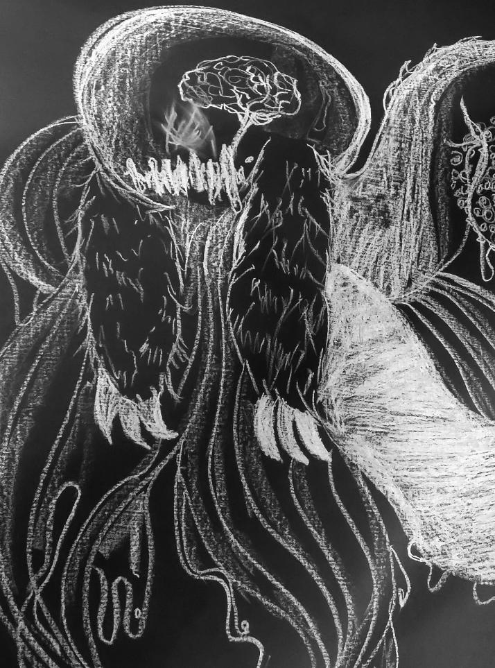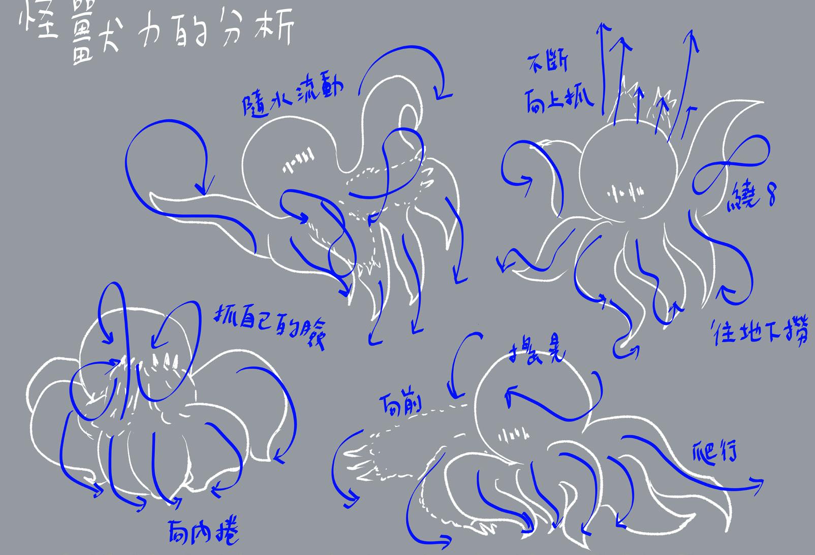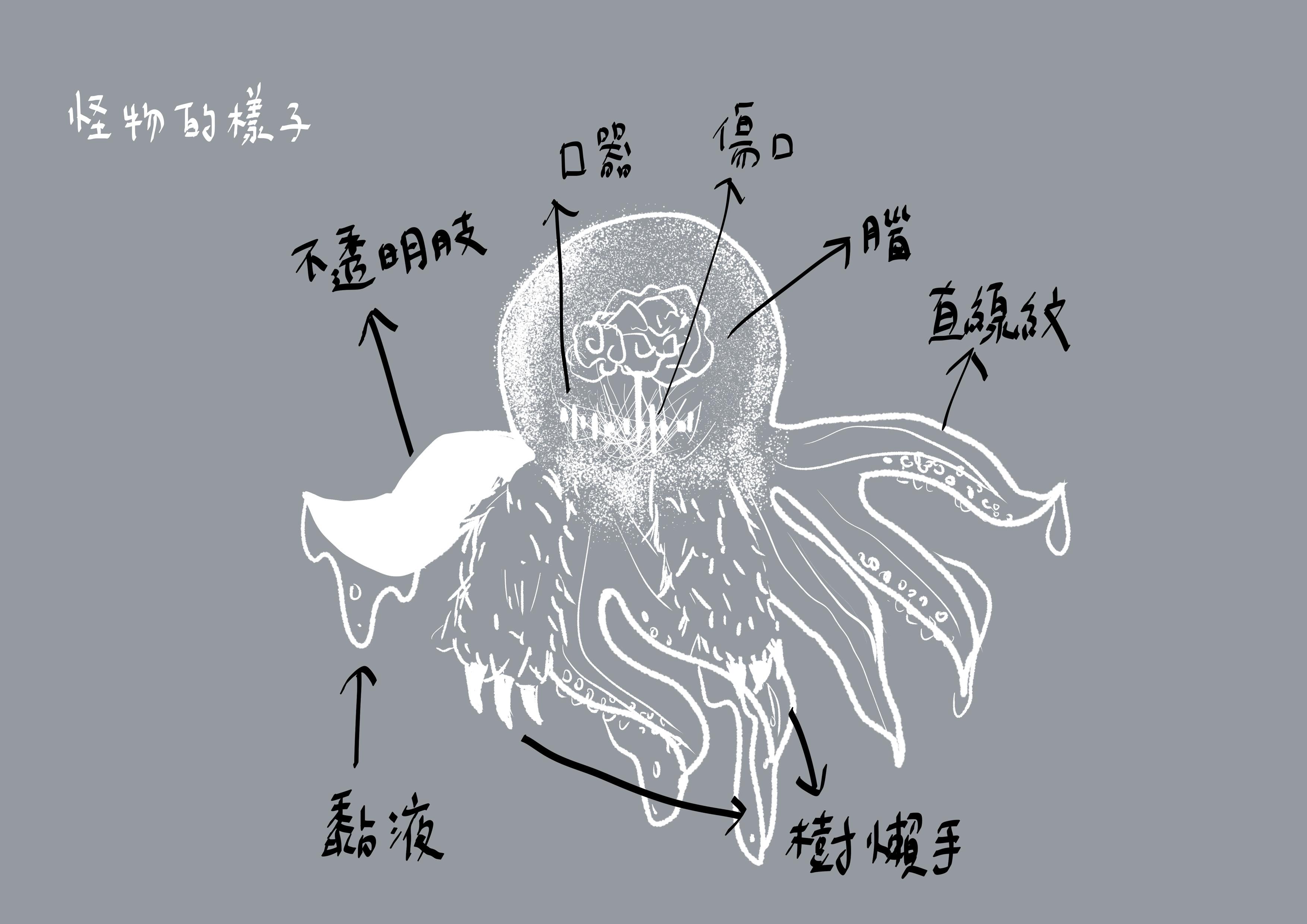 在開始動力裝置前,老師要我們尋找心中的怪獸,我一開始找不到, 便回去翻自己過去在心理狀態非常糟糕時購買的詩集。聶魯達的《青 銅色海豚》中寫到「直到海終於吞噬它,啃食它青銅色的驕傲,將 它捲入沙中。」當時我只下意識是覺得自己的怪獸也在海中,但不 知道他的模樣是什麼。他總是出現在我極度焦慮時用他那不像任何 生物姿勢像我爬行而來,並以如同黏膜破裂的嘴腐蝕我,在那之後 他將自己隔絕開來,在我心中不斷掙扎並揮舞著他的觸手,他傷害 了我也傷害自己,就像與家人間的衝突一樣令人崩潰又無法割離。
