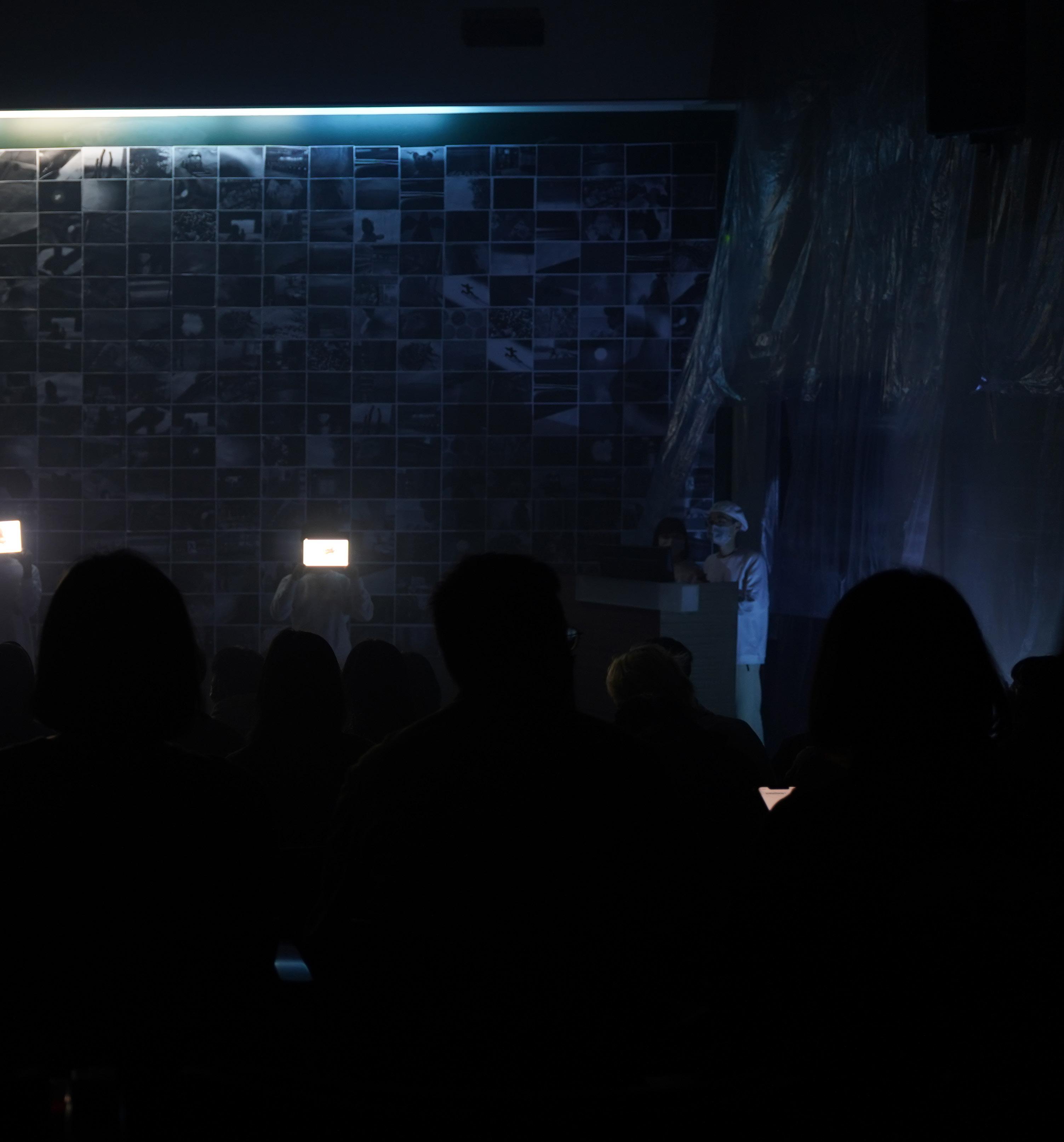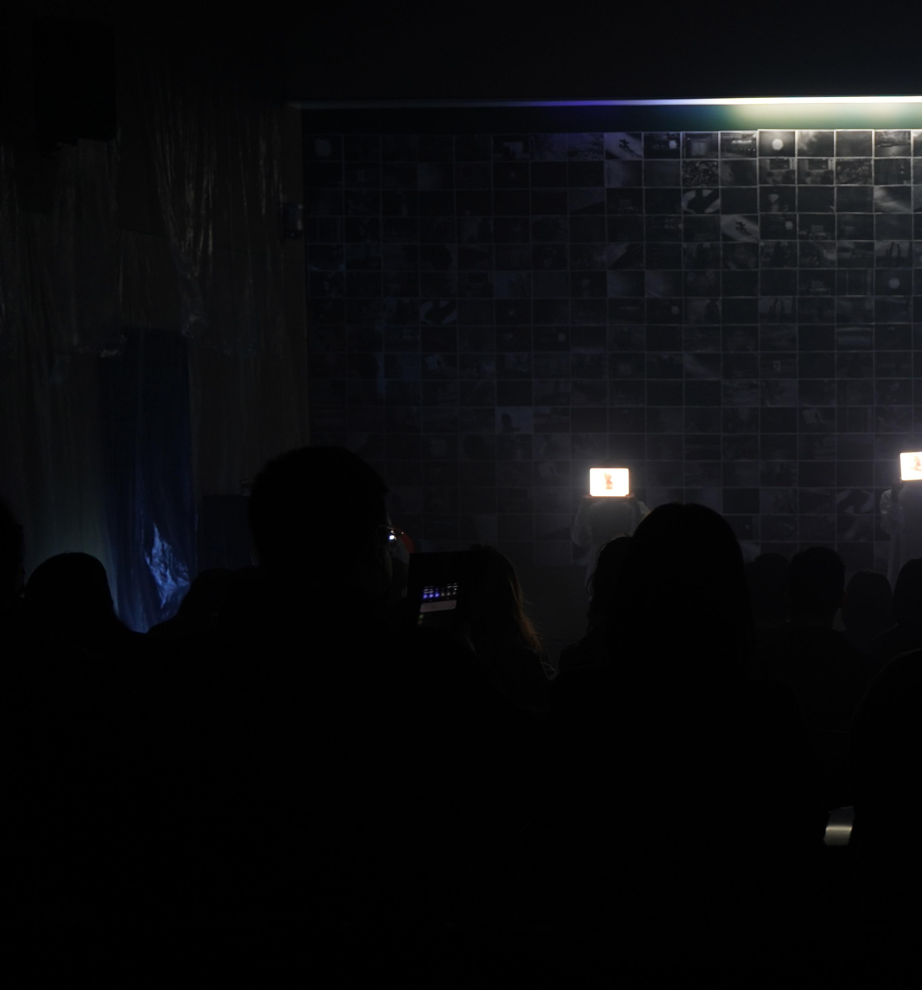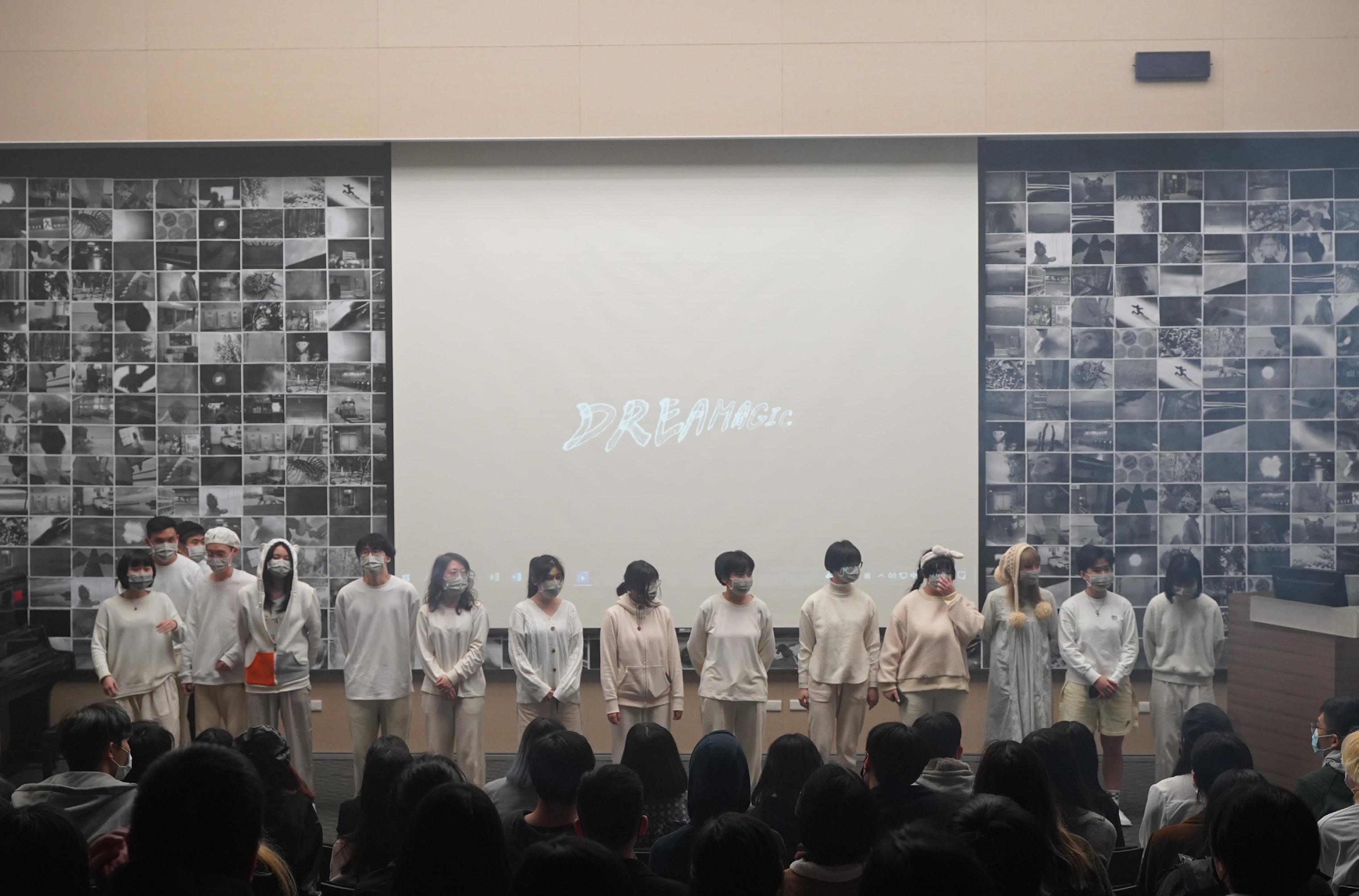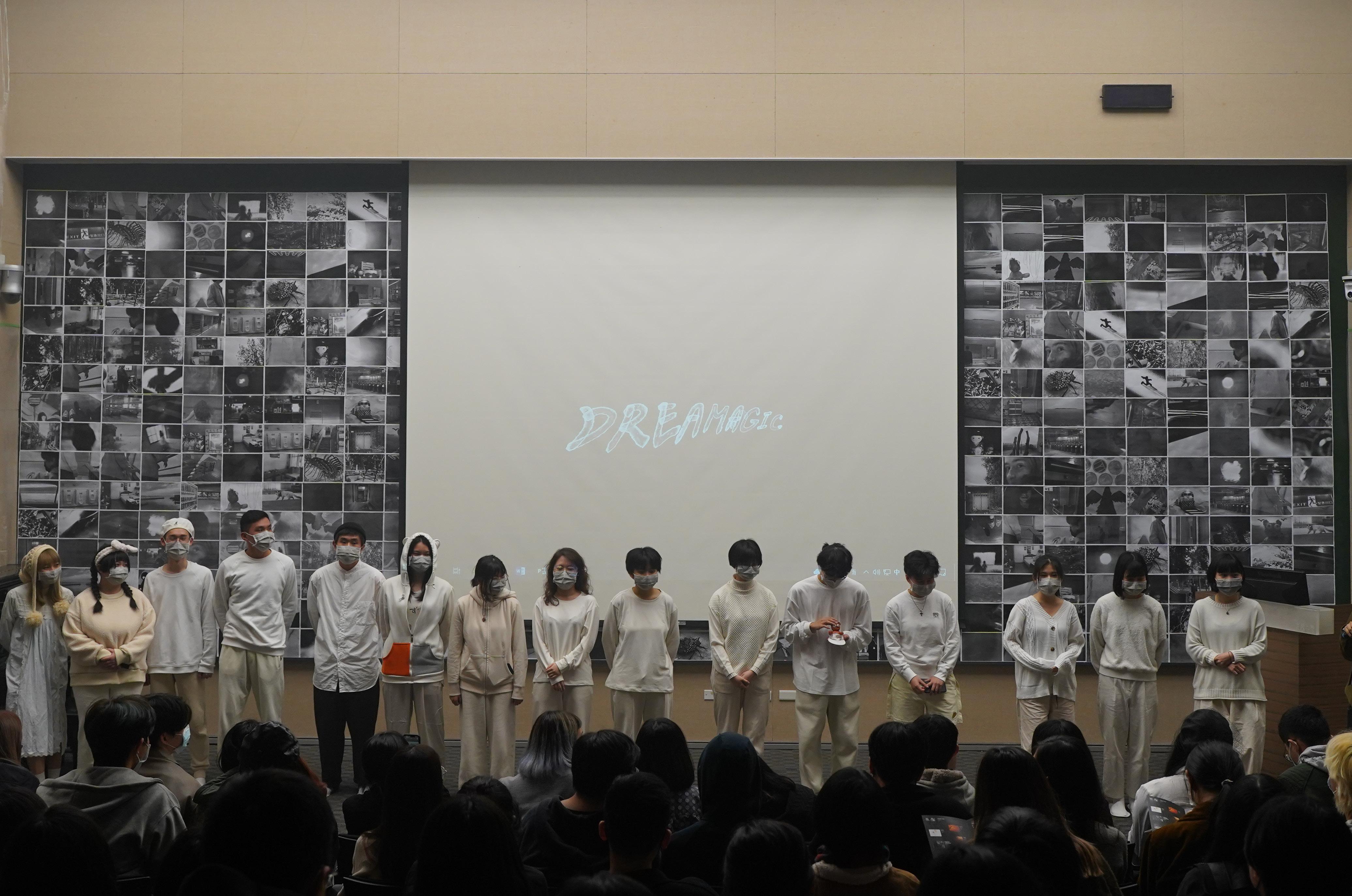 夢是什麼感覺呢?我們認為夢是朦朧的、是靛 藍色的、是被包圍住的。在這個專題中我擔任 場地布置的負責人,負責討論場地布置的材料 並準備,以及租借特效機器還有協調組員的工 作時間。場地中我們在挑高的場地懸掛上大量 養生膠帶,並配合雲霧機試圖製造出屬於我 們的穆荷蘭大道。觀眾換上飯店用拋棄式拖 鞋的那刻,映入眼簾的只有穿睡衣的我們和播 放泥偶的平板電腦,一切都很不合理,卻也 因為如此想看清未知的後續。為了製作出這 些能夠吸引觀眾的佈置,組員們除了在期末 的壓力下掙扎,也同時成為彼此最協力的後 盾。我很謝謝這份團結以及溫柔,是因為彼此 的互相協助才有了這份不只是期末的展演。