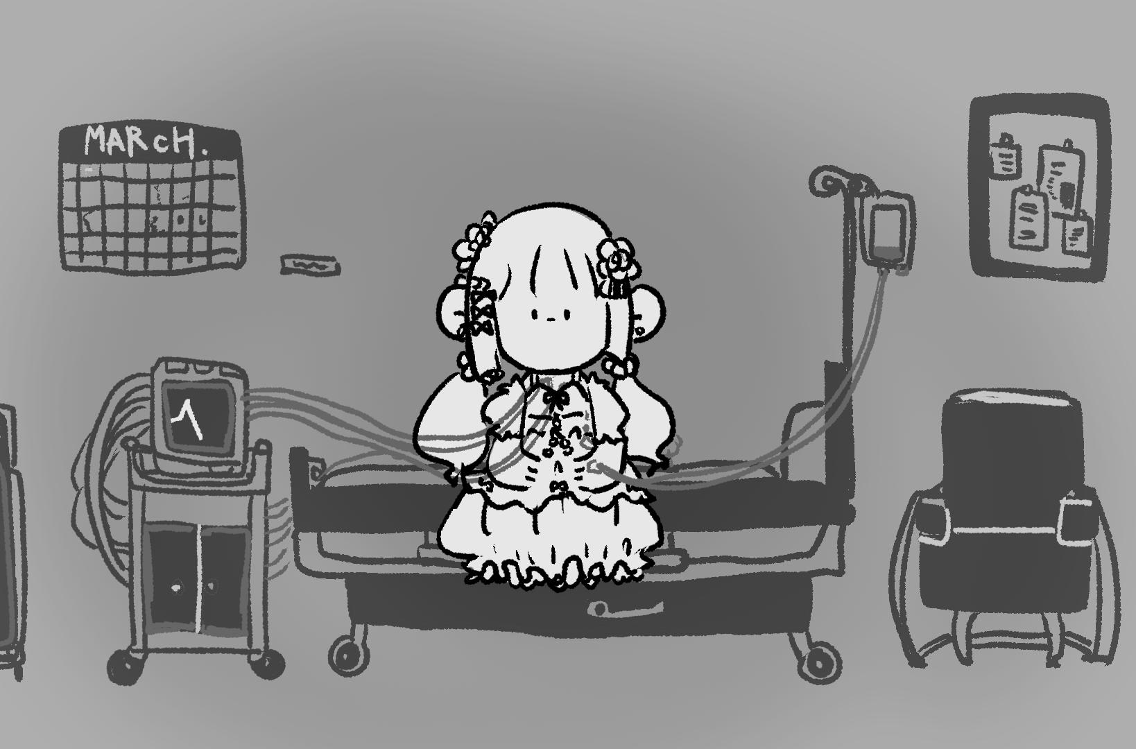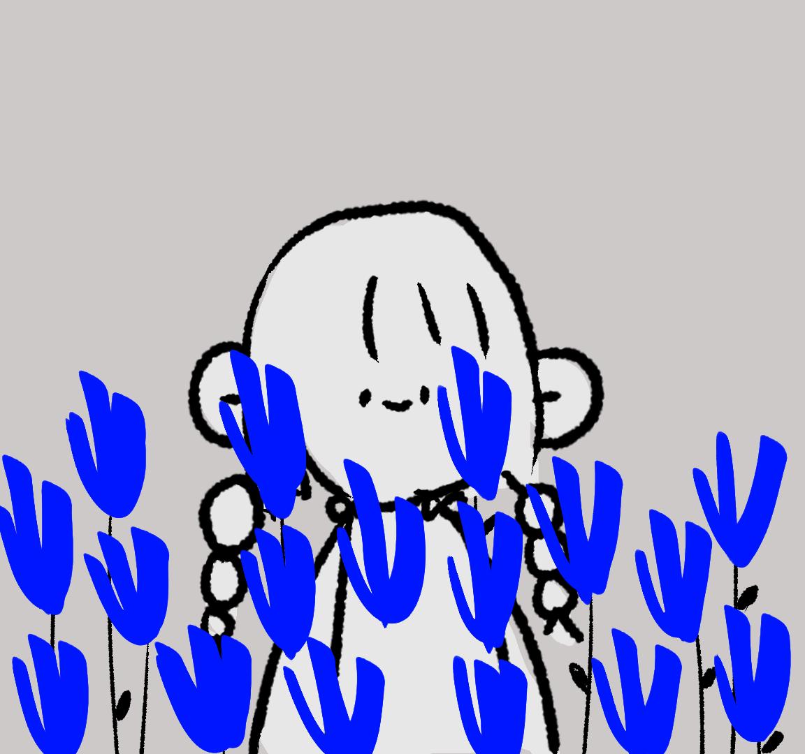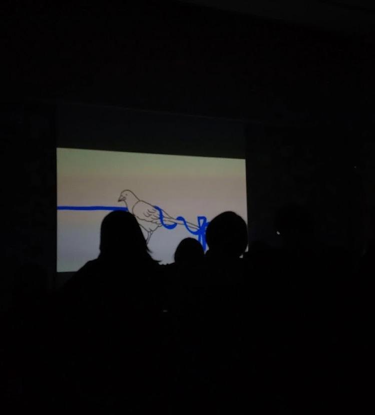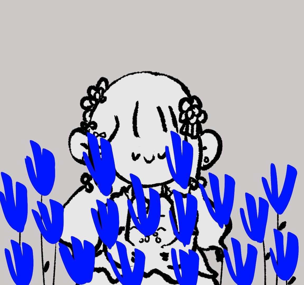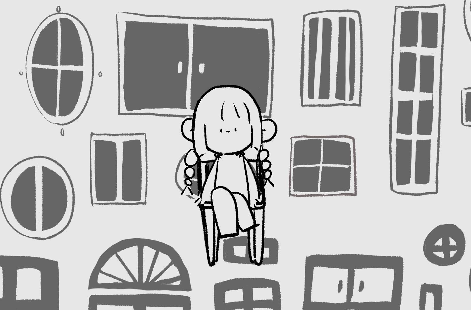 關於焦慮、擁抱與和解的三個夢製作手繪動 畫。高中的我在日常中一直被當作某種待解剖 的生物審視,沒有回應只是被盯著的焦慮,就 像窗戶沒有光,黑色的對面不知道有什麼恐 懼。而為了當個符合規定的學生,我壓抑了所 有嚮往的部分,想要反抗,得到的回應揭示冷 言冷語。我感到疲憊無力,如同住院時什麼都 不能做,只剩心跳,盲目的被灌輸威權體制教 育的點滴。大學後看到的東西很寬廣,像一片 沒有被圍起來的花園,我可以一直做創作不被 限制,穿衣服也能開始像我自己,即使還沒有 完全逃離別人的眼光。兩個我都得到了和解, 擁抱於藍色中,過去的焦慮也慢慢解開,而 解開的契機是代表我的潛意識的台灣藍鵲。
