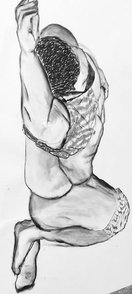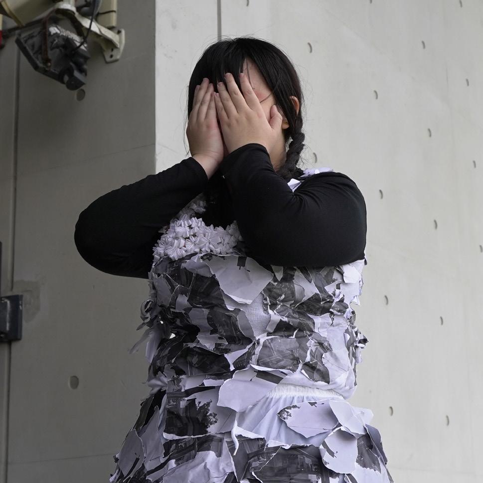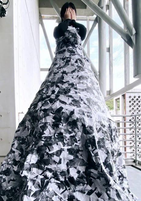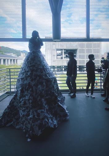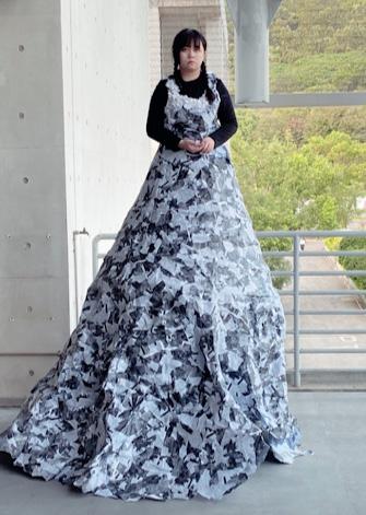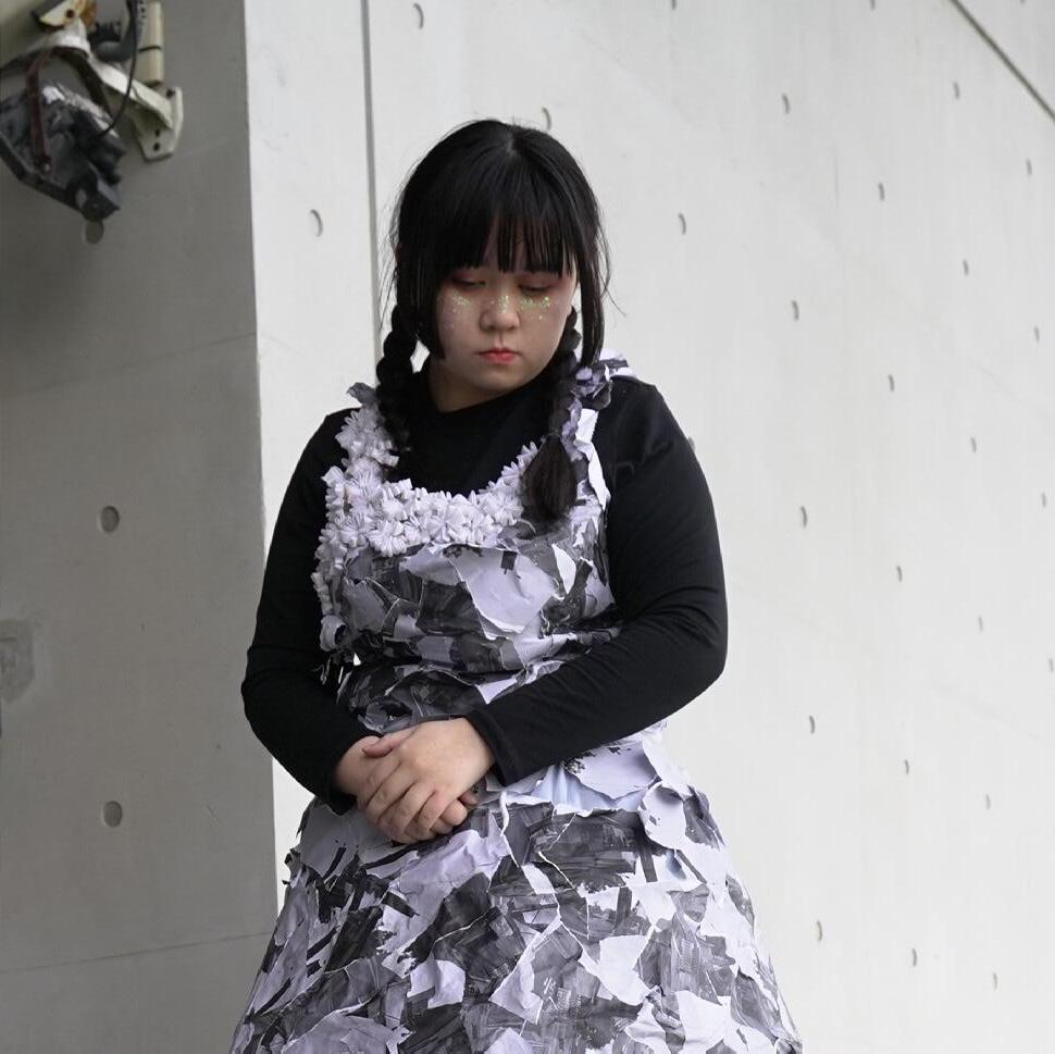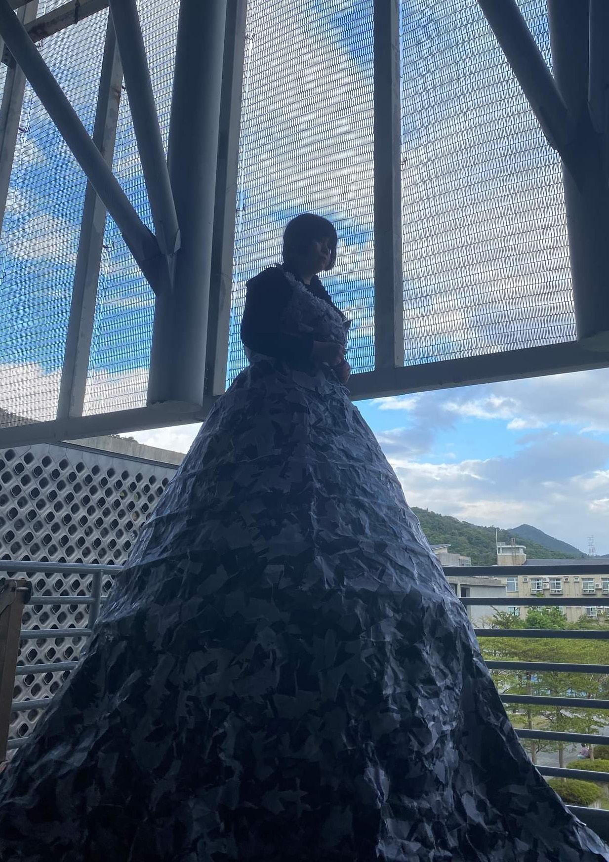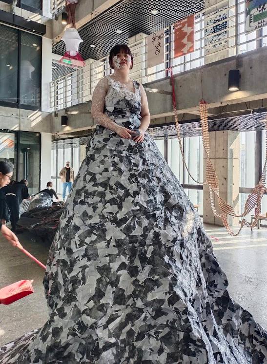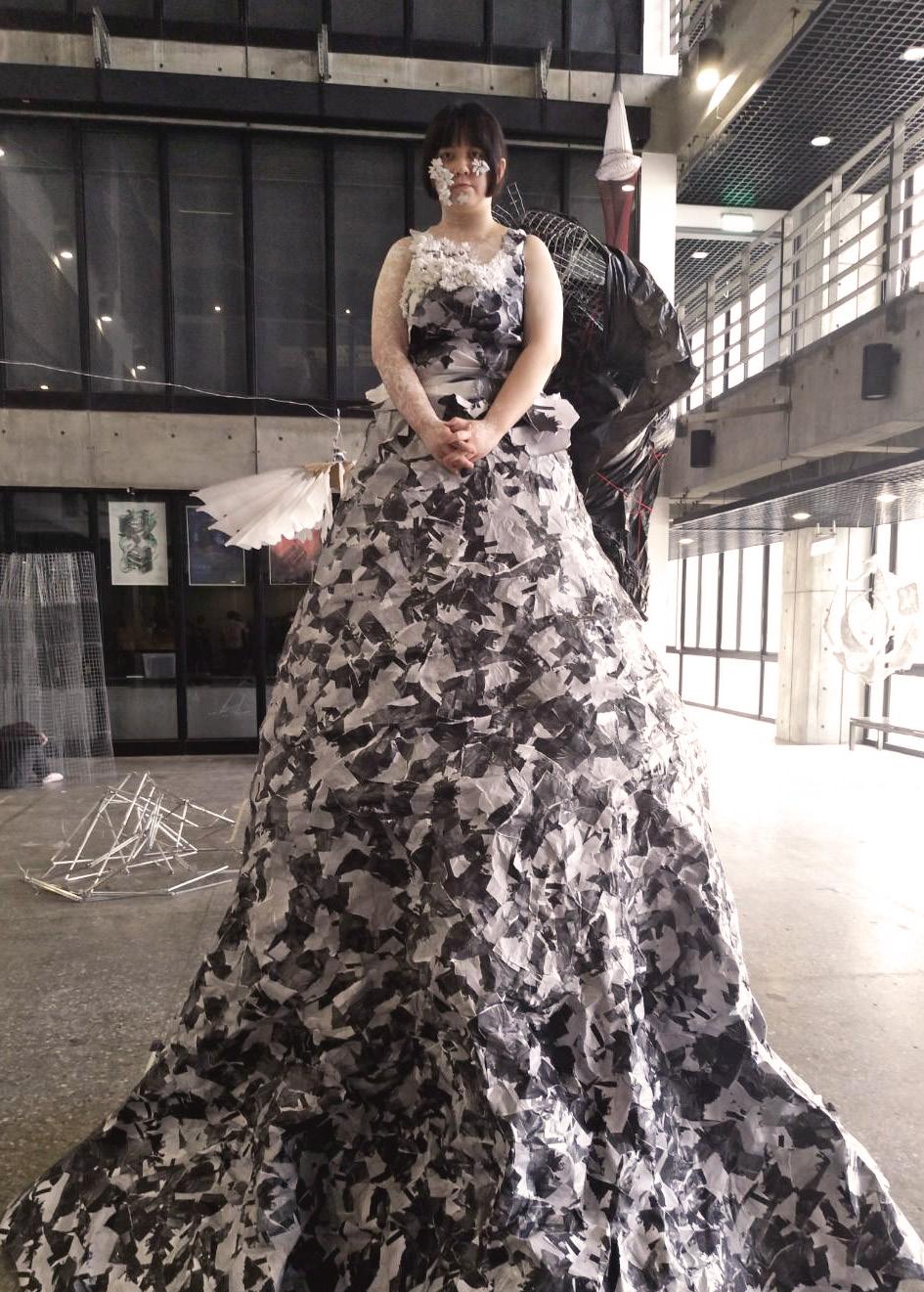 作品代表著從對我來說像是夢魘一樣的高中 脫離。剛上大學的我 即使來開了那個還殘留 髮禁、服儀規定的地方,但好像所有的一切 卻仍然像在暗處一般被監視著,好像自己無 法脫離那樣的囚禁,所有日常的喜好和表現 自我都被貼上名為錯誤的標籤。在那樣的不 安下我決定把不斷徘徊腦海中的校門景象列 印出來並撕碎,好像破壞那些重組成屬於我 的模樣後就能掙脫出枷鎖了。偌大的裙襬和 象徵蛻變的布花像努力蓋過這些灰暗一般, 雖然不完整但以自己的姿態成長著,是我對 自己的期許,也是我在這裡蛻變的過程。