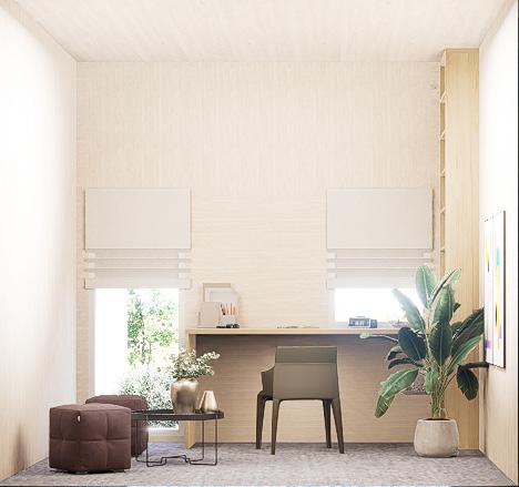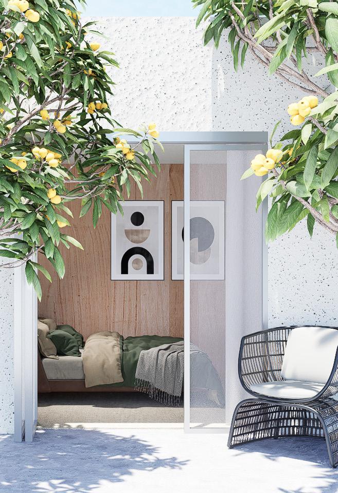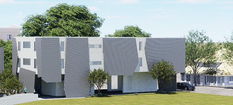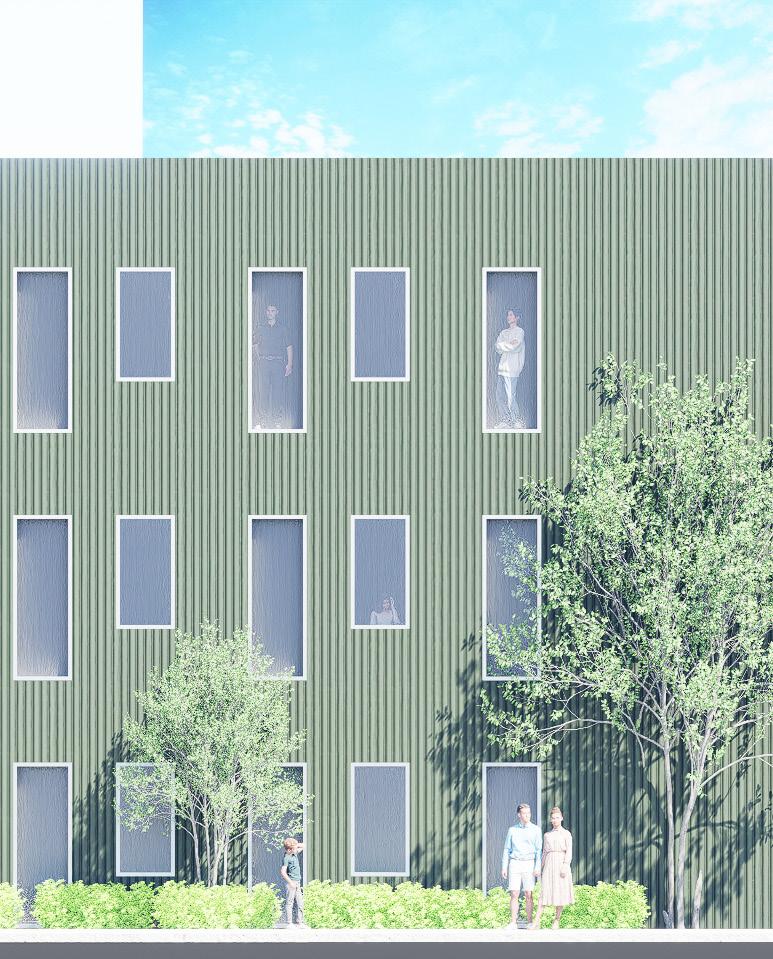 The building’s exterior features a distinctive design with randomly shaped corrugated metal panels, which not only adds visual interest but is also easy to maintain. Each unit is equipped with a semi-private courtyard. Rather than maximizing the building’s footprint, I focused on increasing green spaces to enhance sunlight and ventilation. This approach allows residents to enjoy different courtyards while maintaining privacy for each unit.