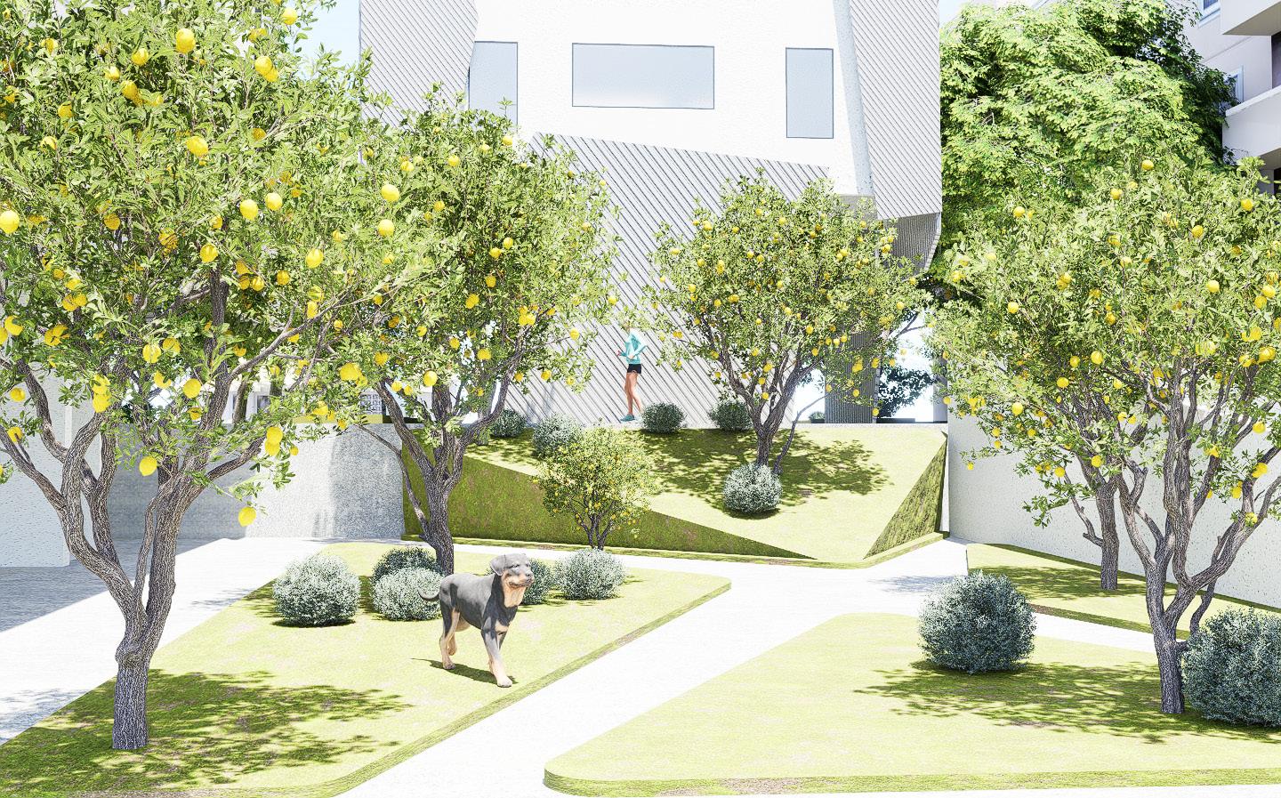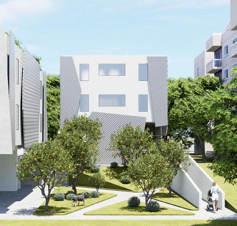 The site is surrounded by high-density neighborhoods and a two-story single-family home next door. The concept focuses on reimagining modern living, with units organized around a central courtyard to foster a sense of community and connection among residents. The design consists of two separate buildings, linked through thoughtful landscape design that also enhances green spaces. To soften the structure’s rigid lines, I incorporated curved, undulating glass facades and organic landscape features, emphasizing the integration of urban green areas.