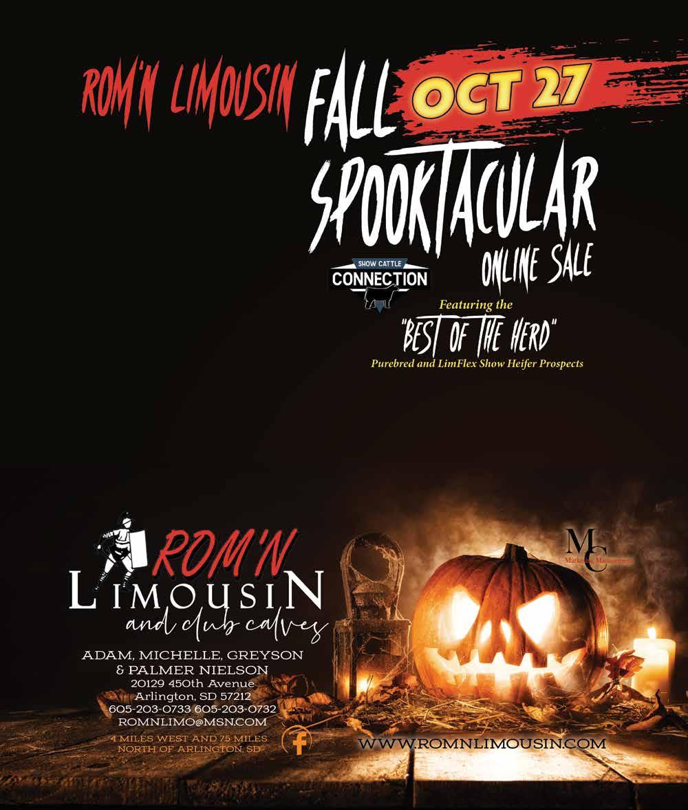 Where Show Cattle Are Born Boonsboro, MD Chris Thomas 301-730-9561 • Lonnie Thomas 301-730-9571 www.thomasandsonfarms.com “Like” our Facebook page for photos and updates leading to sale time! SALE CONSULTANT: AUTO Lucky Guy 140D TASF Grey Goose 333G TASF Crown Royal 960C CJSL Dauntless 6257D EF Xpect The Best 341X AUTO Peyton 206Y MAGS With Class 208W PRIVATE TREATY BID-OFF OCTOBER 15, 2022 Showcasing 12 Elite Limousin & Lim-Flex Lots View on ShowCattleConnection.com. Call with bids. IVHunnies Halloween KILEY McKINNA, Owner • 402-350-3447 • Kiley@MCMarketingManagement.com WILEY FANTA, Junior Sales & Service Associate • 320-287-0751 • Wiley@MCMarketingManagement.com • OCTOBER 202272