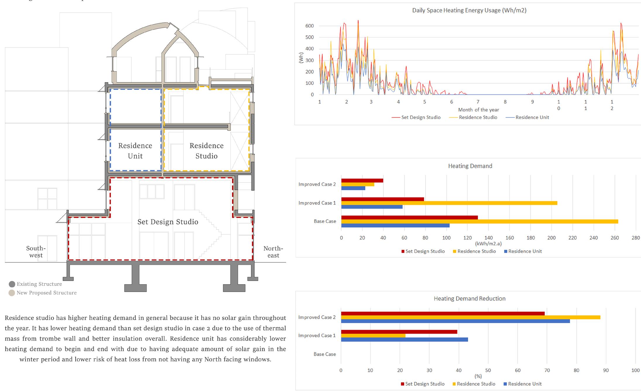 Design within the context of dynamic building performance calculation of a small dwelling in London with principles related to the climatic conditions through simulation in Design Builder software . The aim is to optimise the building energy consumption particularly in heating/cooling demand whilst improve the spatial quality for the buillding users including testing it against CIBSE TM59 overheating risk assesment.