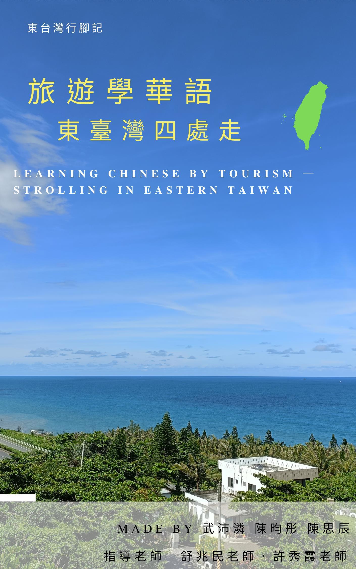 旅遊學華語──東臺灣四處走 編輯團隊|東臺灣行腳記 作 者|陳昀彤、陳思辰、武沛潾 指導教授|舒兆民老師、許秀霞老師 單 位|國立臺東大學華語文學系 課程名稱|華 Young 百出 112 級華語文教學專題 出版日期:2022 年 12 月