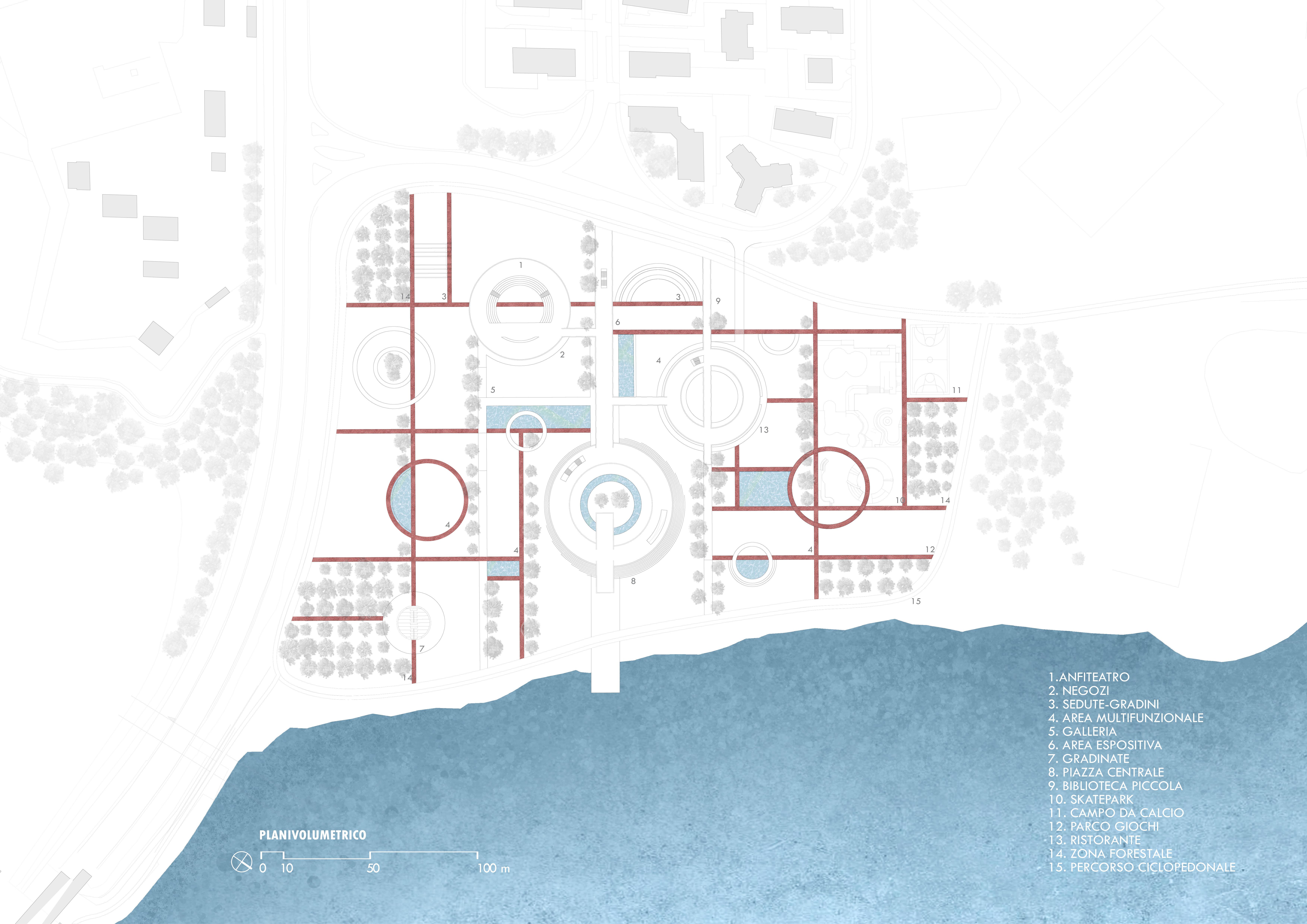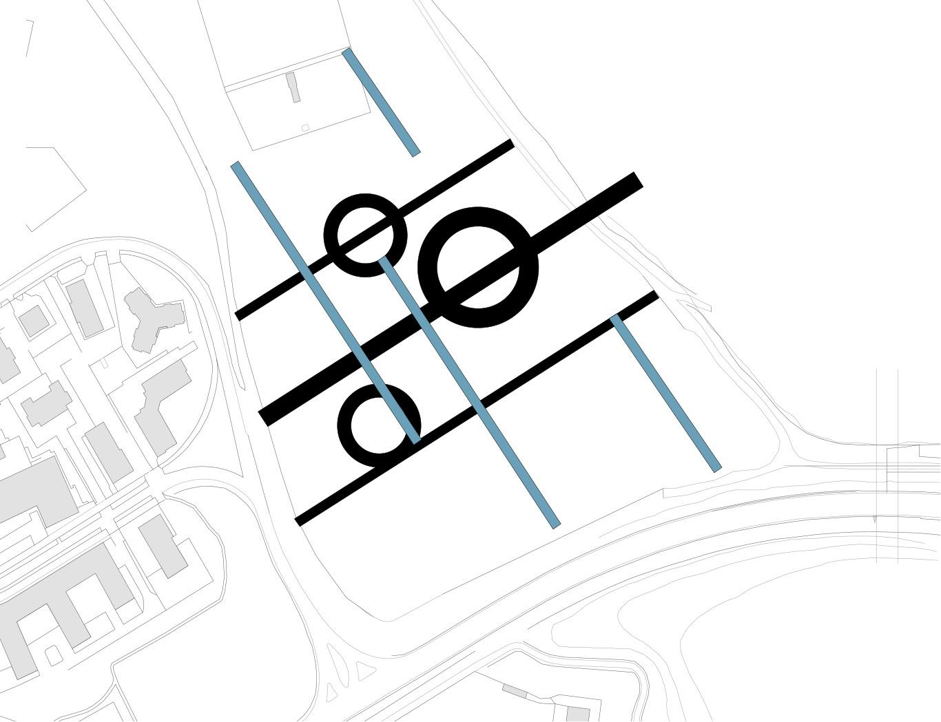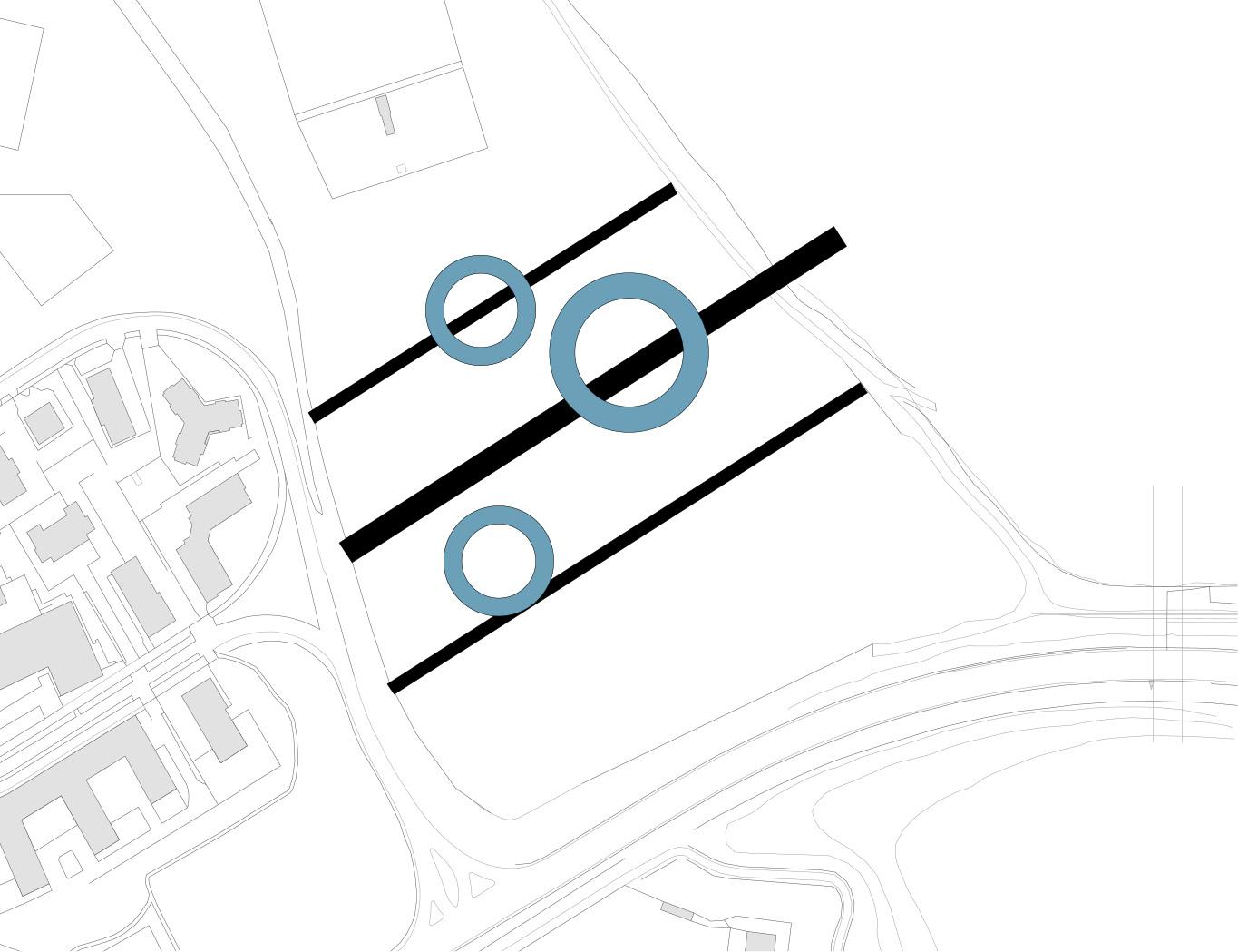 They take up the geometry of the circles of the industrial area on the other side of the lake to create shaded areas and services.