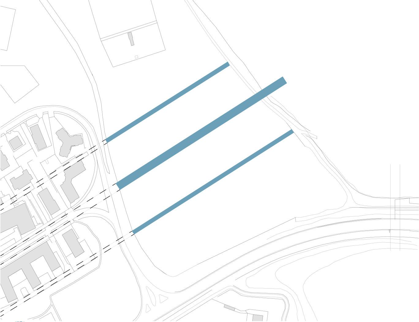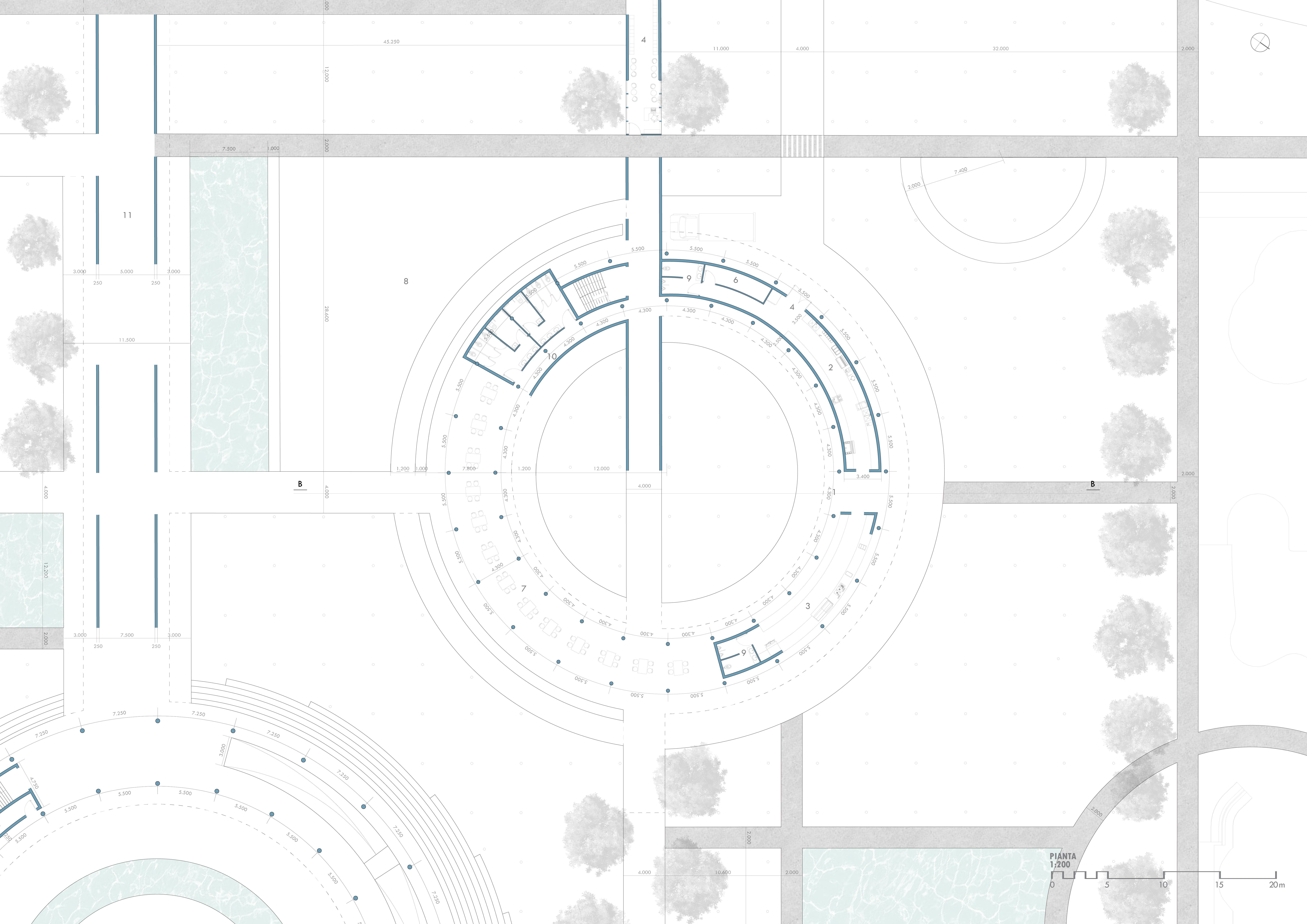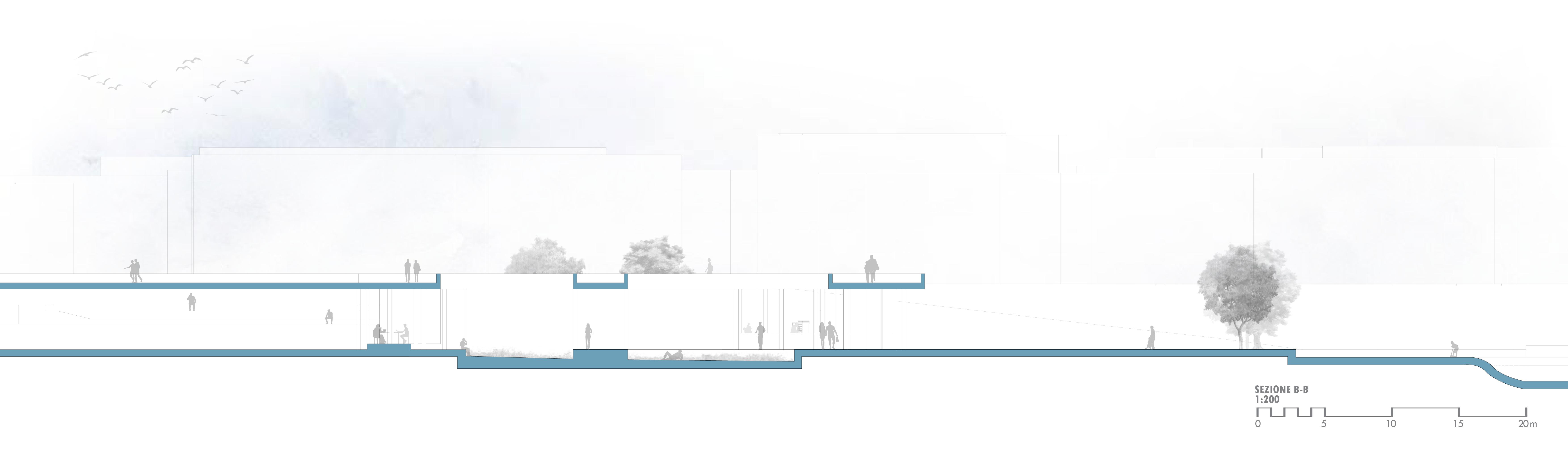 They take up the geometry of the circles of the industrial area on the other side of the lake to create shaded areas and services.