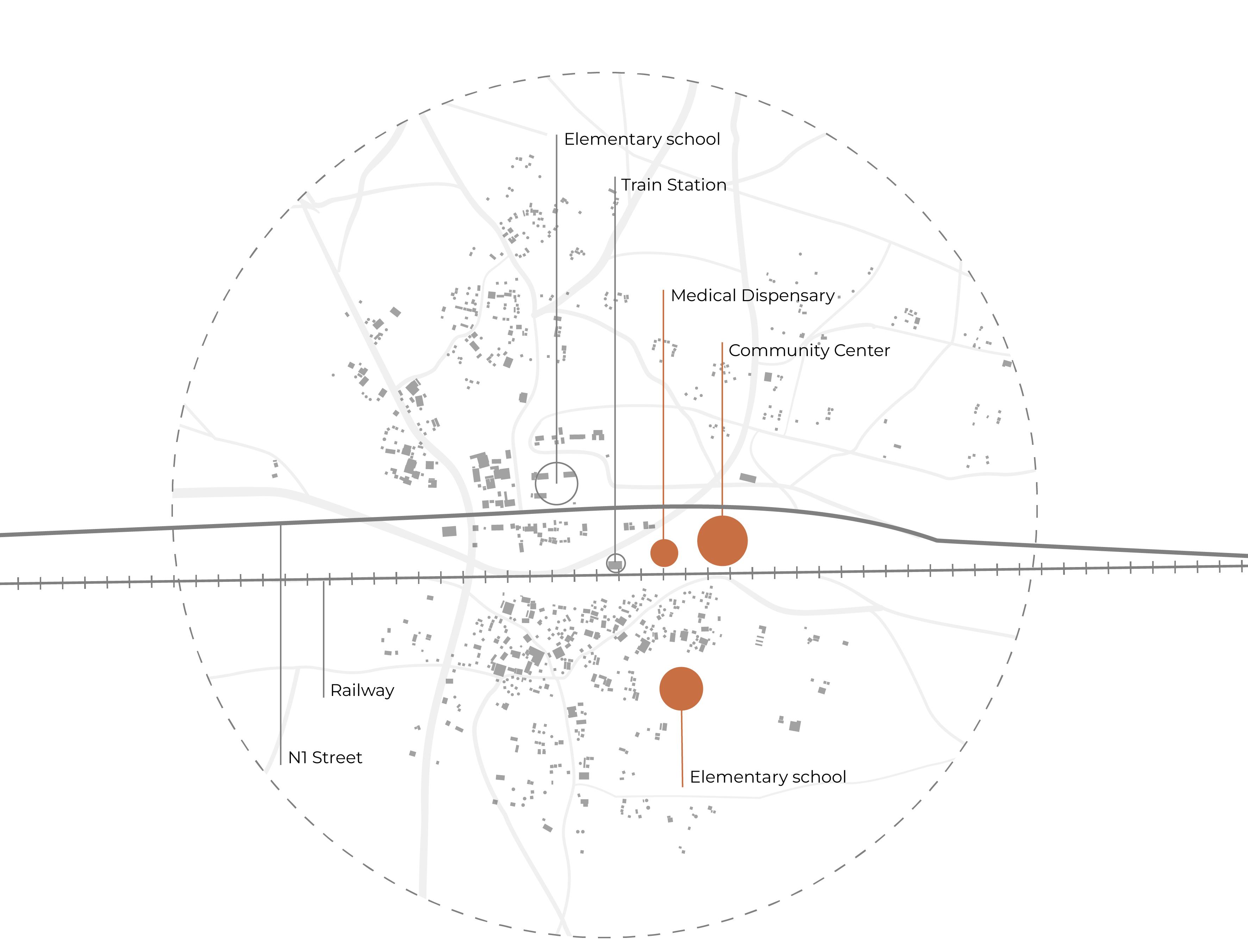 The medical dispensary is positioned in the middle part, closest to the train station, to ensure convenient accessibility from all possible roads. This central location optimizes ease of access for residents, particularly in emergency situations, and supports efficient healthcare delivery to the entire village population.