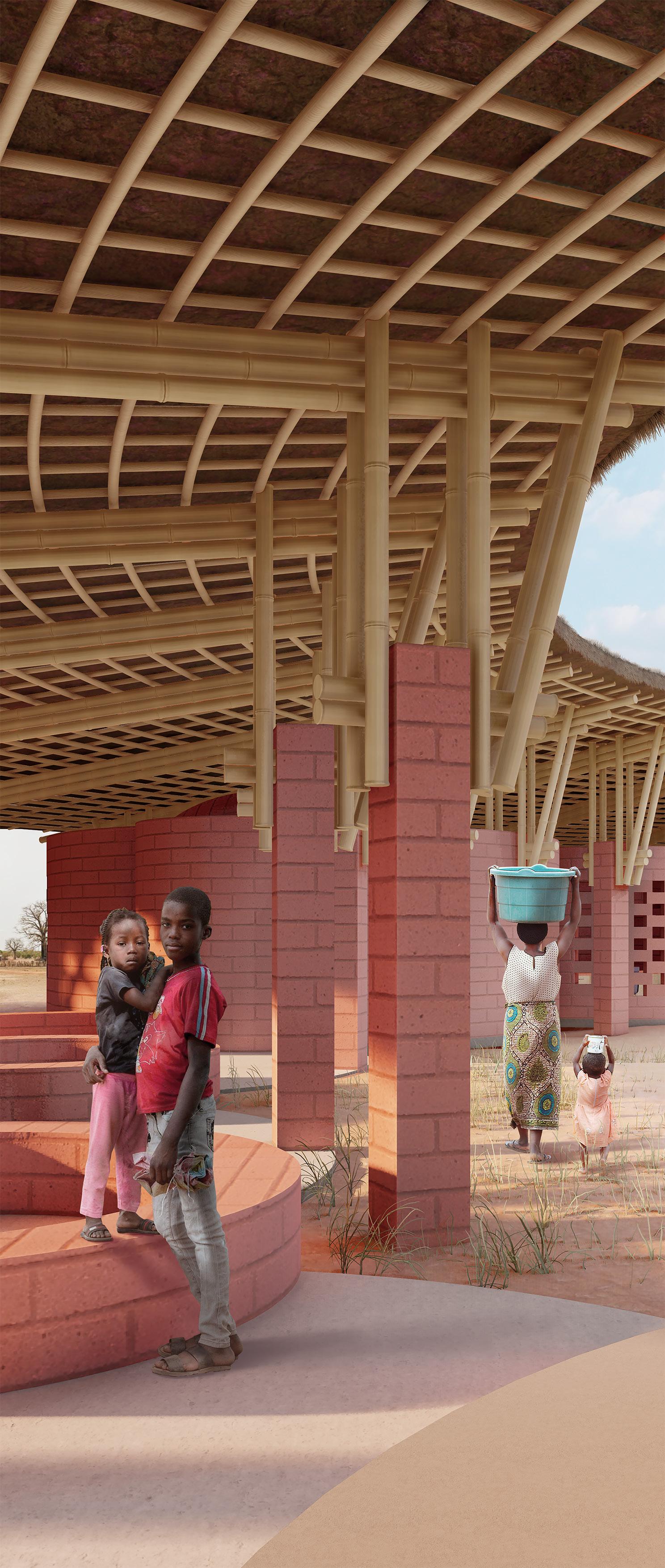 The decision to incline the roof inward, in contrast to the previous projects like the school and the community center, was made to create a sense of coziness and enclosure within the clinic. This design choice aims to provide patients with a comforting and sheltered environment during their visit, enhancing their overall experience and sense of well-being.