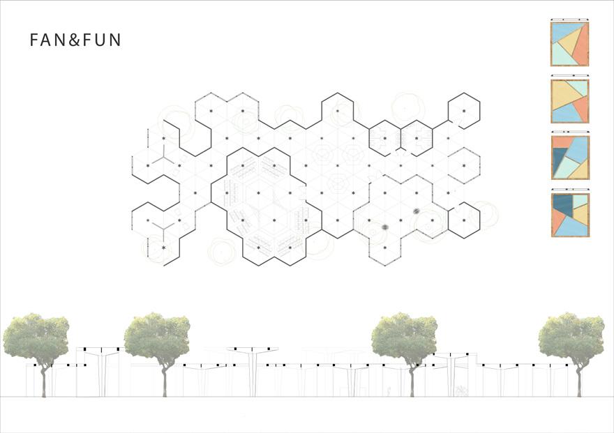 Dada la naturaleza temporal del torneo, el proyecto fue concebido como una estructura de madera ligera, desmontable y fácilmente transportable. Para lograrlo, se desarrolló un módulo independiente, capaz de repetirse tantas veces como fuera necesario, adaptándose sin esfuerzo a los diferentes obstáculos a lo largo del bulevar, como árboles, aceras y farolas. El uso del hexágono permitió la creación de espacios atractivos y funcionales sin necesidad de modificar el entorno urbano existente, un aspecto fundamental, ya que el torneo dura solo unos días, pero la calle sigue siendo una parte permanente de la ciudad.