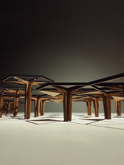 El pilar y los cerramientos son los principales elementos que aportan flexibilidad al proyecto. Además, el módulo hexagonal de madera permite una construcción rápida, sencilla y de bajo costo, tres factores esenciales para esta intervención. Gracias a la forma del módulo, las dos puertas se adaptan al contexto e integran armoniosamente en él. Los pilares, compuestos por tres partes, son fáciles de transportar y ensamblar. Asimismo, se emplean dos tipos de cerramientos, opacos y translúcidos, según el uso del espacio. Los cerramientos translúcidos añaden color a la monotonía de la madera, inspirándose en el trencadís de Gaudí, un icono de la ciudad.