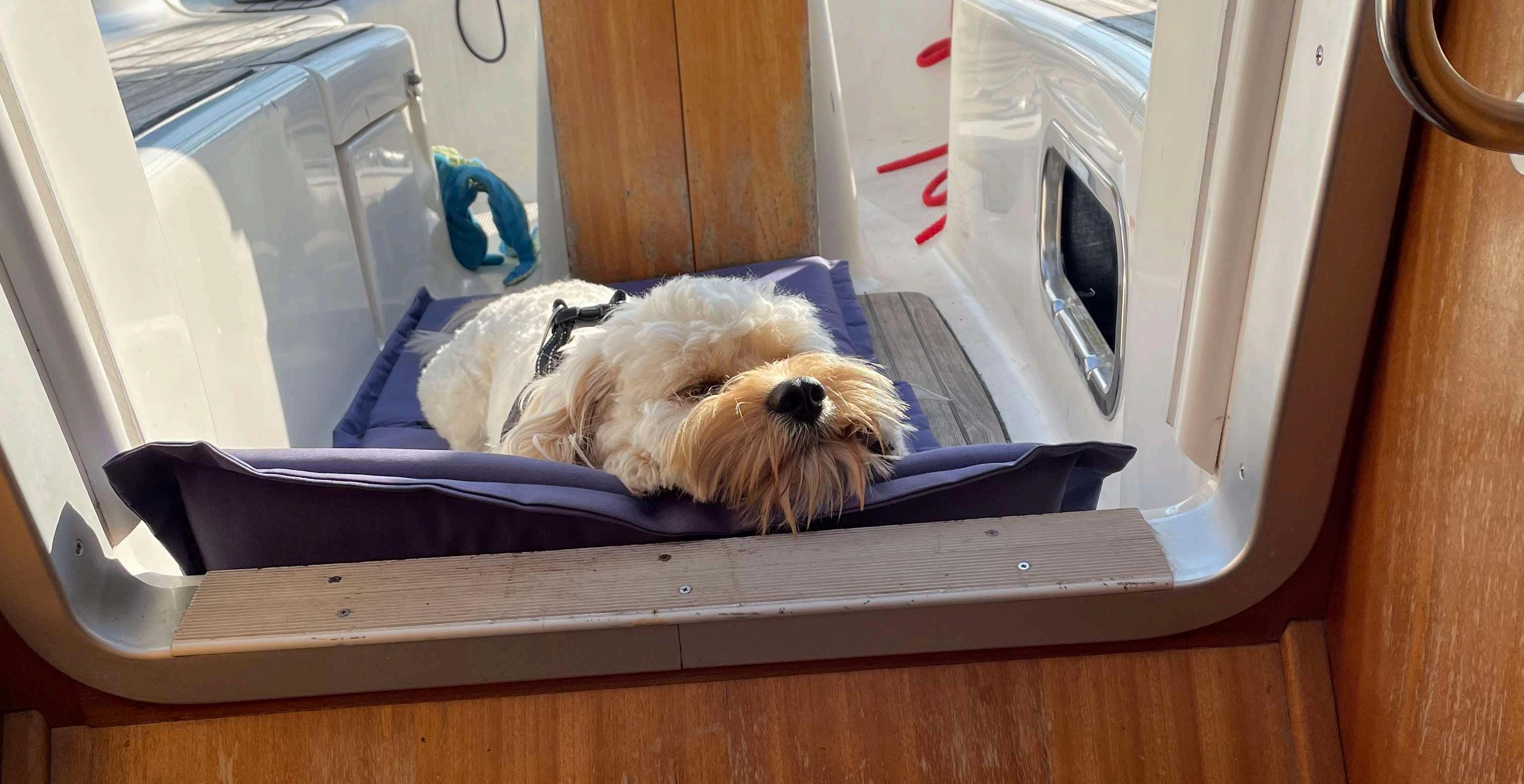 Ombord på Girasole märkte hussen Per Joel Jarlunger redan under de första turerna att hunden behövde lite tid för att vänja sig vid vågorna och de nya ljuden.