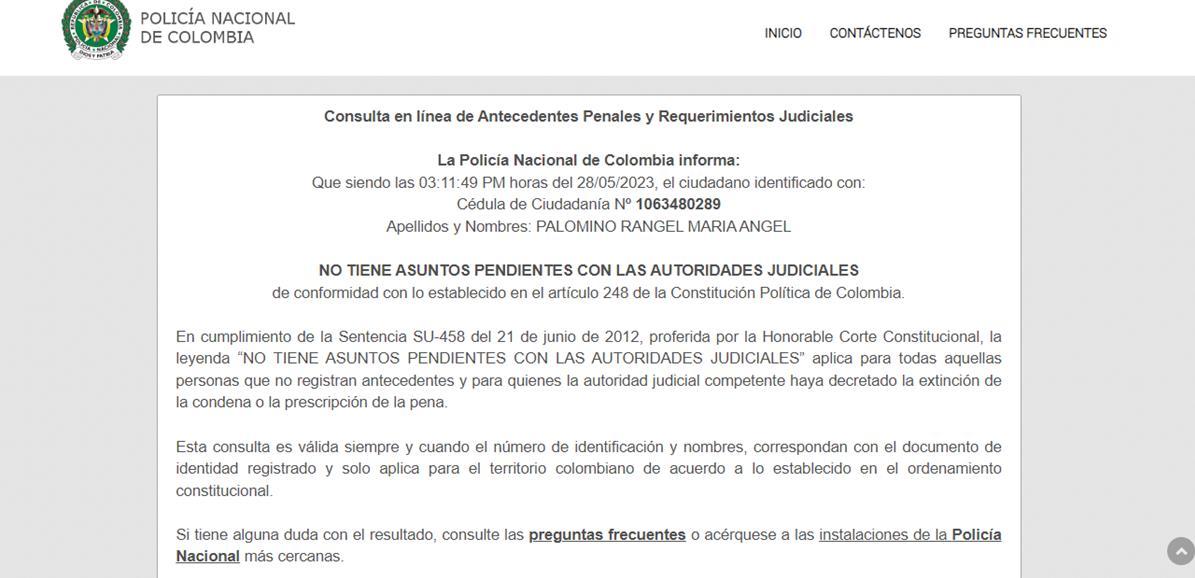 gistro de Sanciones e Inhabilidades(SIRI), el (la) señor(a) MARIA ANGEL PALOMINO RANGEL identificado(a) con Cédula de ciudadanía número 1063480289:
