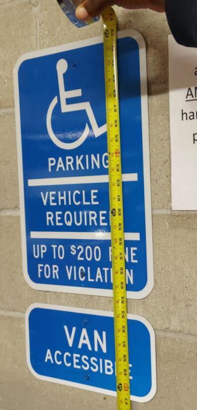 Parking space identification signs shall include the International Symbol of Accessibility complying with 703.7.2.1. Signs identifying van parking spaces shall contain the designation"van accessible." Signsshall be60inches (1525 mm) minimum abovethefinish floor or ground surface measured to thebottom of the sign.