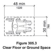 305.3 Size. The clear floor or ground space shall be 30 inches (760 mm) minimum by 48 inches (1220mm) minimum.