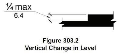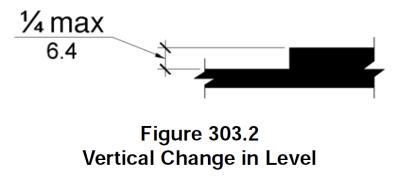 302.3 Openings. Openings in floor surfaces shall be of a size that does not permit the passage of a 1/2 inch (13 mm) diameter sphere, except as allowed in Sections 407.4.3, 408.4.3, 409.4.3, 410.4, and 805.10. Elongated openings shall be placed so that the long dimension is perpendicular to the predominant direction of travel.
