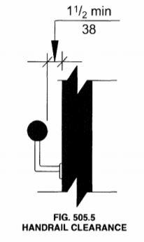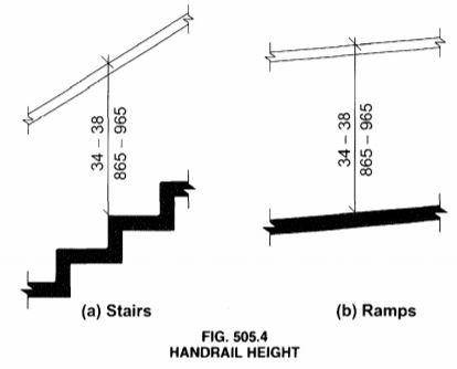 505.4 Height. Top of gripping surfaces of handrails shall be 34 inches (865 mm) minimum and 38 inches (965 mm) maximum vertically above stair nosings, ramp surfaces and walking surfaces. Handrails shall be at a consistent height above stair nosings, ramp surfaces and walking surfaces.