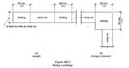Ramp runs shall have a running slope not steeper than1:12. Cross slope of ramp runs shall not be steeper than1:48. The rise for any ramp run shall be 30 inches (760 mm) maximum. Ramps shall havelandings at thebottomandtopof each ramp run. Landingsshall comply with Section 405.7.Landingsshall have aslope not steeper than 1:48 and shall comply withSection 302. Landings shall have a clear length of 60 inches (1525 mm) minimum.