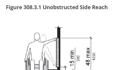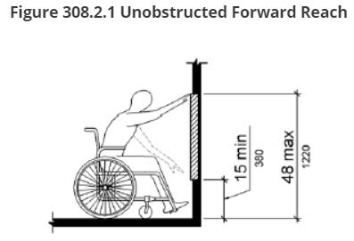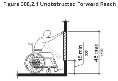 308.2.1 Unobstructed Where a forward reach is unobstructed, the high forward reach shall be 48 inches (1220 mm) maximum and the low forward reach shall be 15 inches (380 mm) minimum above the finish floor or ground.