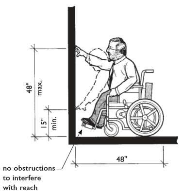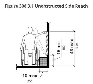 Where a forward reach is unobstructed,thehigh forward reach shall be 48 inches (1220 mm) maximum and the low forward reach shall be 15 inches (380 mm) minimum above the finish floor or ground.