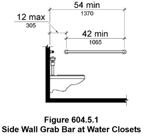 604.7 Dispensers. Toilet paper dispensers shall comply with 309.4 and shall be 7 inches (180 mm) minimum and 9 inches (230 mm) maximum in front of the water closet measured to the centerline of the dispenser. The outlet of the dispenser shall be 15 inches (380 mm) minimum and 48 inches (1220 mm) maximum above the finish floor and shall not be located behind grab bars. Dispensers shall not be of a type that controls delivery or that does not allow continuous paper flow.