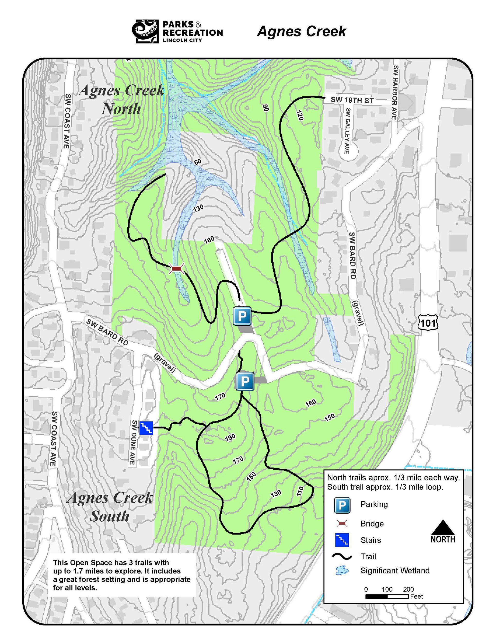 Recorra 1/4 de milla y encontrará los aparcamientos Norte y Sur. Están a tiro de piedra y hay un sendero de conexión. También se puede acceder a Agnes Creek por SW Dune Ave o al final de SW 19th St, con aparcamiento limitado