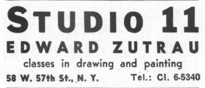 In addition to exhibiting, Zutrau took on commercial jobs and advertised in a 1950 edition of The Art Digest (Fig. 1) that he was offering classes in drawing and painting at Studio 11, 58 W. 57th Street – the historic Sherwood Studio Building designed as artist apartments with studio spaces. The artist married model Kikuko Miyazaki in 1955, and the pair relocated to Japan by 1958 with their young family.