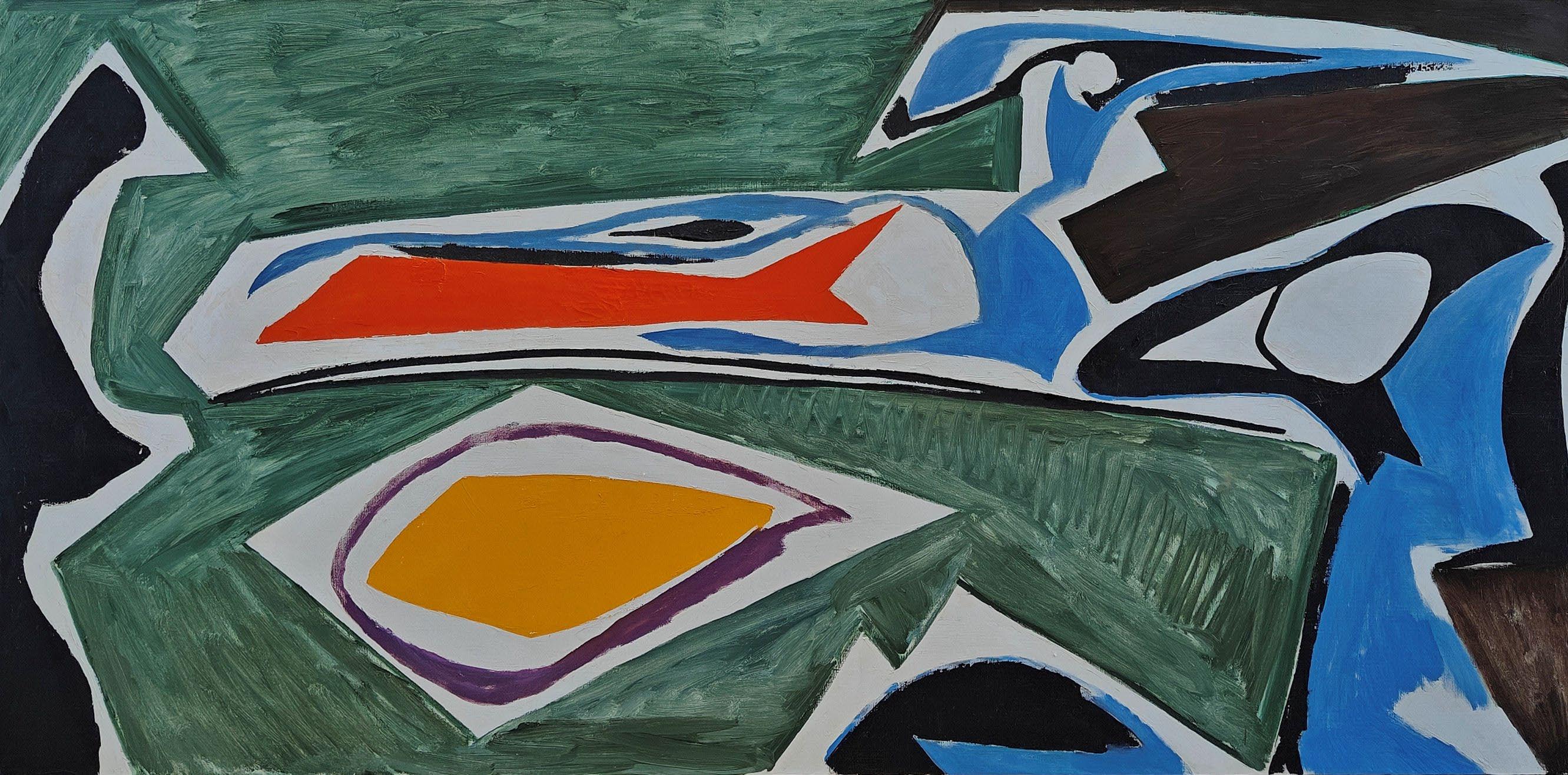 Outside of the artistic sphere, the country’s economy was beginning to stabilize with improved production of exports like cameras, motorcycles, and television sets – this is the landscape Zutrau entered when he relocated to Japan in 1958. The outpouring of ideas and philosophical debates around subjects like aesthetic, design, functionality, and the avant-garde provided fertile ground for Zutrau, then in his mid-30s, to develop his own philosophies around painting. Interestingly, two separate reviews of his solo exhibitions in Japan mention the quality of space within his paintings – a 1959 review on his show at Chuo Koron Gallery states Zutrau’s work has a decorative yet romantic quality that culminates in an “East Asian space feeling,”7 while another review for his exhibition at Tokyo Gallery reads “The work consists of paintings with flat color composition and caliagraphic [sic] lines. The essential qualities of this painter is mostly made clear by the former, and is made of bright clear colors painted broadly and by the relationship of various shapes, space is created.”8